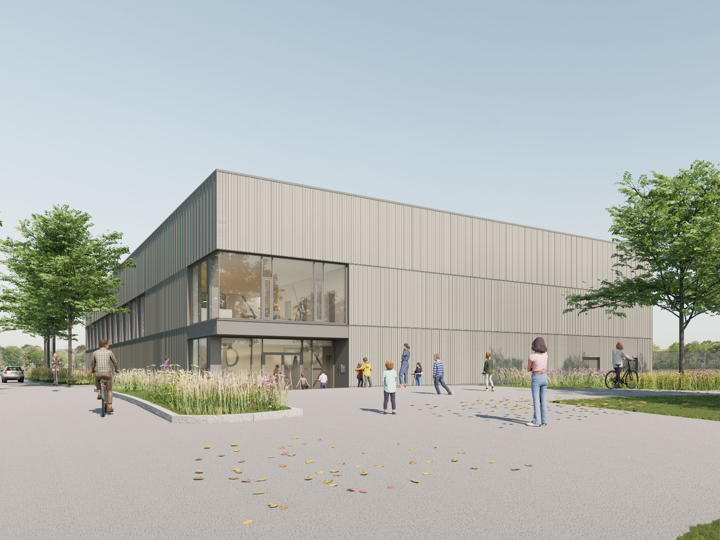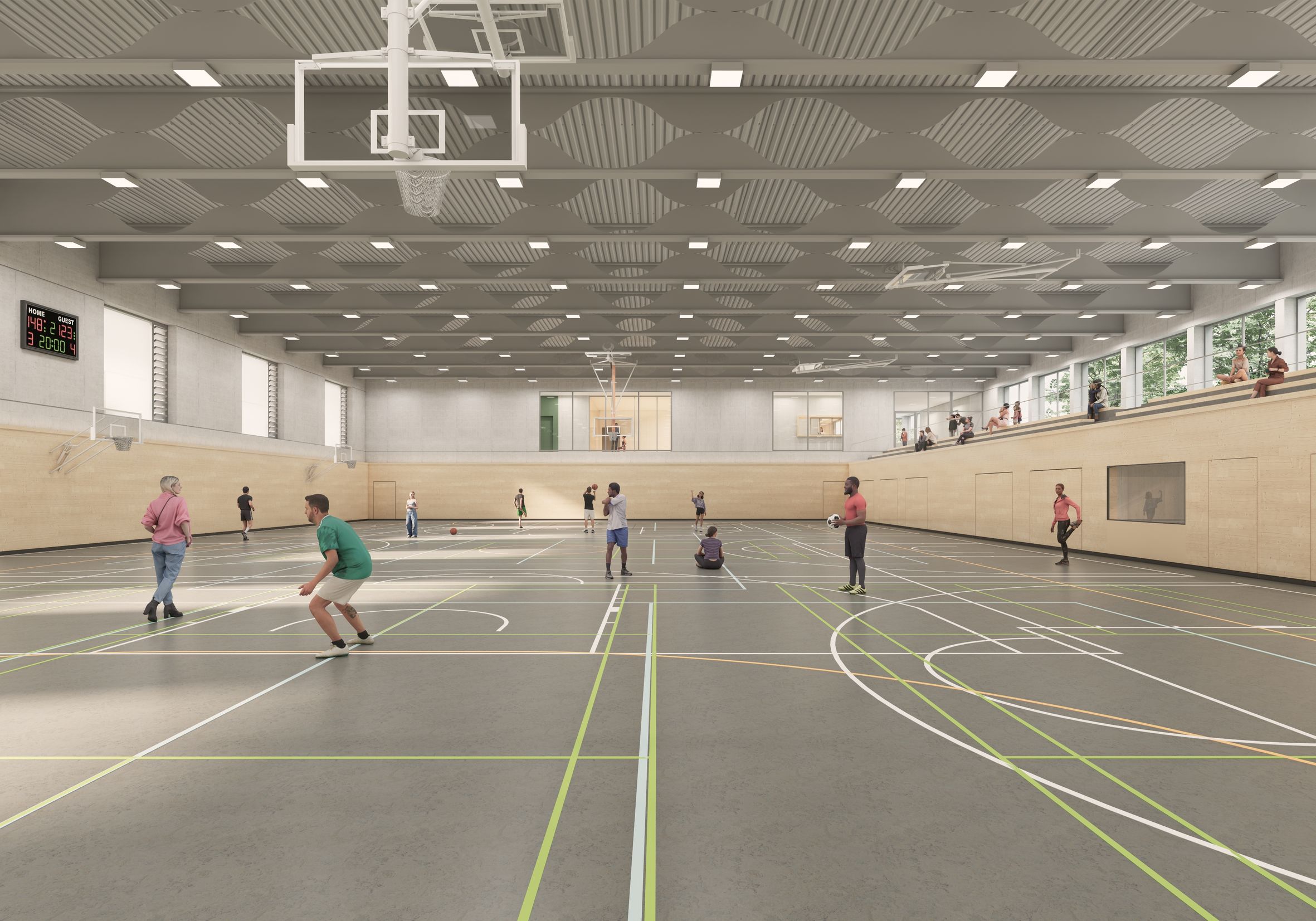 Die neue Sporthalle wird mit einer Holzfassade errichtet. Eine Photovoltaikanlage auf dem Dach und eine Luft-Wasser-Wärmepumpe sorgen für eine nachhaltige Energieversorgung. „Um die Lärmbelastung für das neue Wohngebiet im Norden zu minimieren, legen wir besonderen Wert auf den Schallschutz“, so Planungs- und Baureferent Daniel F. Ulrich. Das Gebäude ist barrierefrei konzipiert und verfügt über eine Zuschauertribüne für 199 Personen. Dank flexibler Trennvorhänge lässt sich die Sporthalle in drei separate Bereiche unterteilen, wodurch eine parallele Nutzung für verschiedene Sportarten wie Handball, Basketball, Badminton, Volleyball oder Turnen möglich ist. Ergänzend wird ein Gymnastikraum im Obergeschoss entstehen. Die voraussichtlichen Gesamtkosten betragen 20,6 Millionen Euro. maj