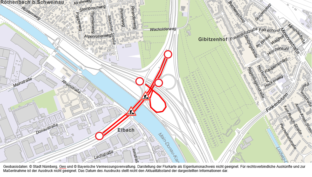 Der Servicebetrieb Öffentlicher Raum Nürnberg (Sör) hat bei den aktuellen Bauwerksprüfungen an den Hafenbrücken Schäden festgestellt. Hierbei handelt es sich um freiliegende Spannglieder an der Unterseite der Brücke und Risse auf der Fahrbahn. Zur genaueren Untersuchung muss die Frankenschnellwegbrücke über die Südwesttangente und den Main-Donau-Kanal deshalb noch bis Dienstag, 24. März 2026, für den Verkehr gesperrt bleiben. Sör führt in dieser Zeit eine detaillierte Begutachtung durch, gefolgt von einer statischen Bewertung, danach wird das weitere Vorgehen abgestimmt. tom