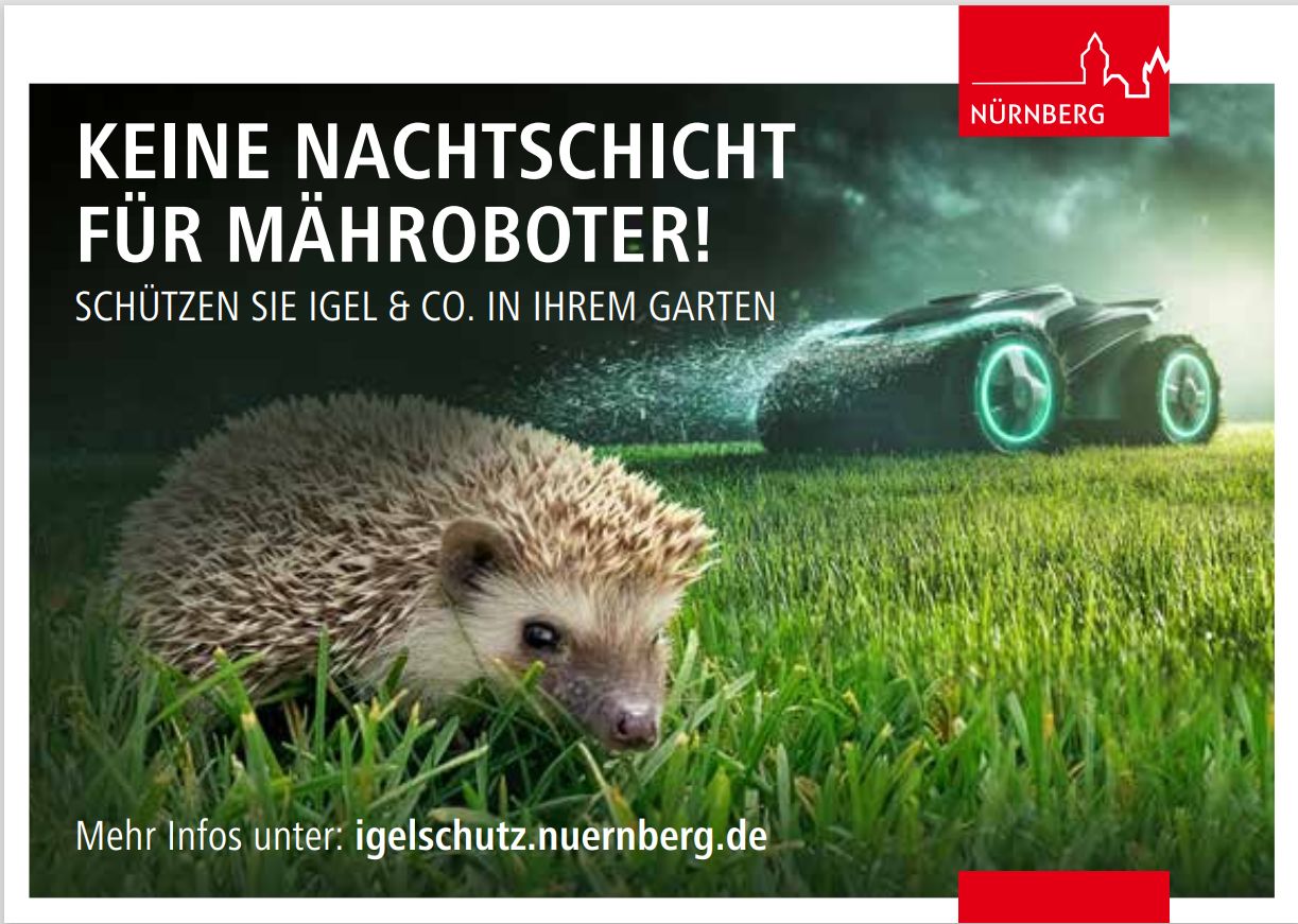 Mit Beginn der Gartensaison sind in vielen Nürnberger Gärten auch wieder Mähroboter im Einsatz. Sie sind eine praktische Alltagshilfe für viele Nürnbergerinnen und Nürnberger. Für Igel jedoch, die primär nachts auf Nahrungssuche unterwegs sind, können nachtaktive Mähroboter zur tödlichen Gefahr werden. Das Referat für Umwelt und Gesundheit appelliert an die Nürnberger Bürgerinnen und Bürger, Mähroboter ausschließlich tagsüber arbeiten zu lassen und in den Abend- und Nachtstunden in der Ladestation zu parken.