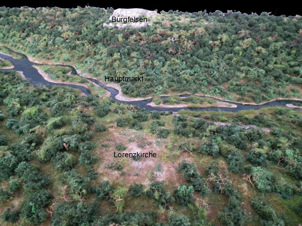 Das circa ein mal zwei Meter große Landschaftsmodell von Herbert Stahl zeigt, dass die Landschaft in Nürnberg vor rund 1 200 Jahren dicht bewaldet war und nur der Burgberg und die Rosenau als markante Punkte herausstachen. Dazwischen schlängelte sich die Pegnitz, noch nicht begradigt und in den heutigen Bahnen. So mussten die ersten frühmittelalterlichen Siedler die Gegend vorgefunden haben, bevor die ersten Bauten entstanden sind. Das anschauliche Modell, das die Nürnberger Innenstadt als ursprüngliche Naturlandschaft darstellt, ist aus über 100 Grabungsberichten entwickelt worden. Die Ausstellung zeigt auch Methoden und Vorgehensweisen, die zu den Ergebnissen geführt haben und was der Untergrund über die Vergangenheit erzählt. maj