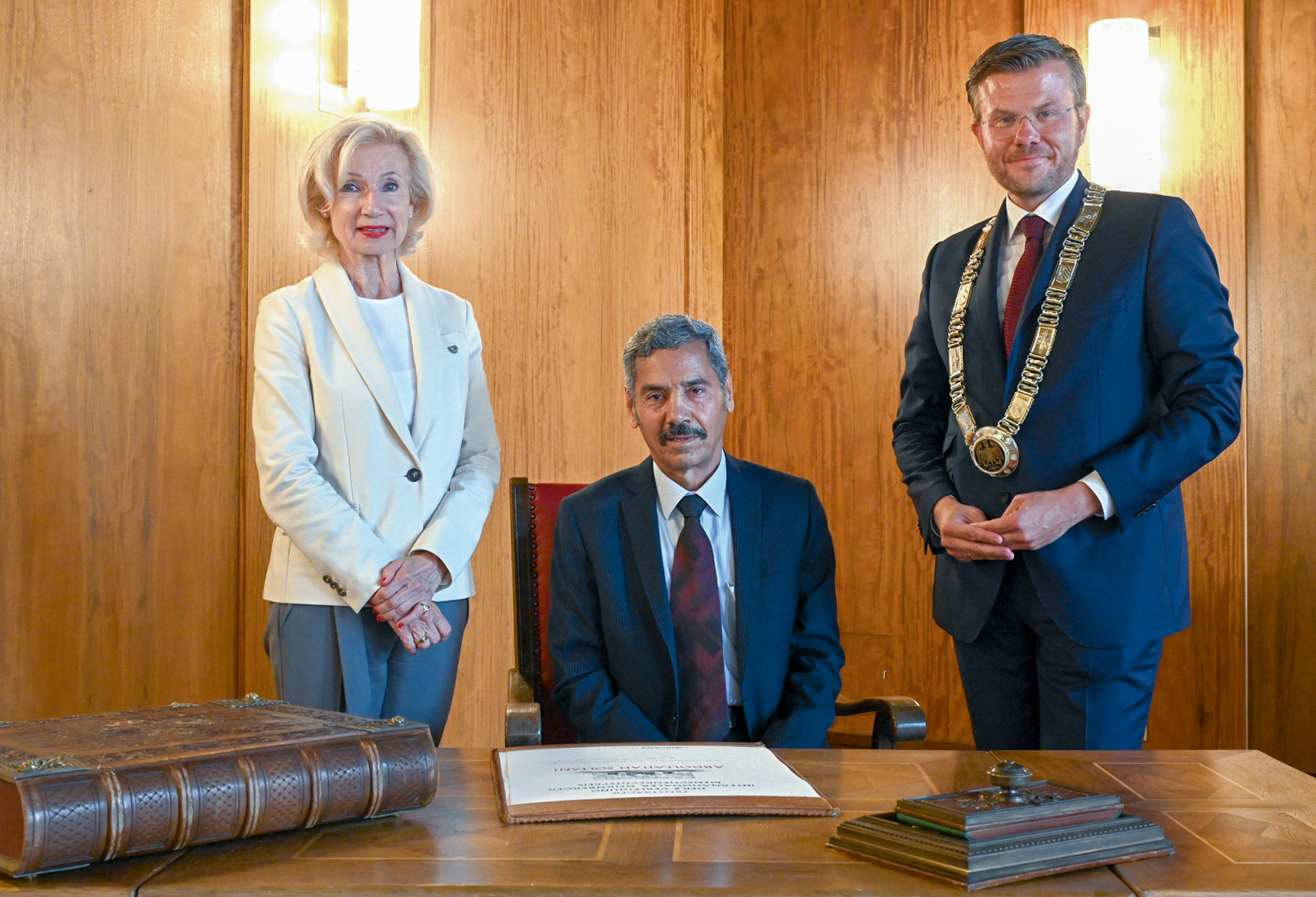 Oberbürgermeister Marcus König hat am Mittwoch, 13. September 2023, zu Ehren des Preisträgers des Internationalen Menschenrechtspreises von 2009, Abdolfattah Soltani, einen Empfang im Rathaus gegeben. 14 Jahre mussten vergehen, bis der iranische Anwalt ausreisen und erstmals nach Nürnberg kommen konnte. In Anwesenheit von geladenen Vertreterinnen und Vertretern aus Politik und Menschenrechtsorganisationen, die sich jahrelang für seine Freilassung aus dem Teheraner Evin-Gefängnis eingesetzt hatten, trug sich Soltani in das Goldene Buch der Stadt Nürnberg ein.