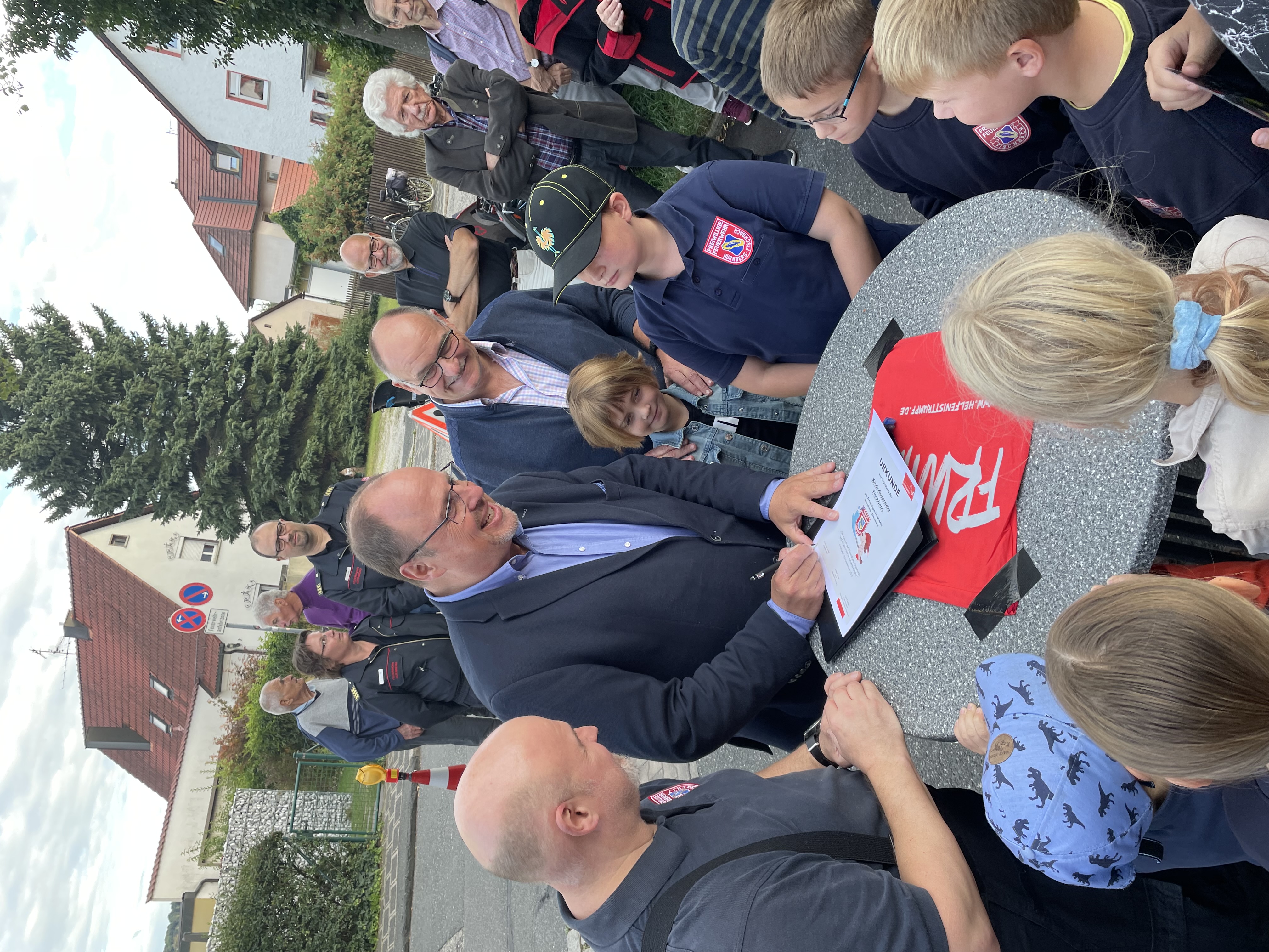 Am Nachmittag gegen 17 Uhr wurde es bei der Freiwilligen Feuerwehr Fischbach vor allem für die ganz jungen Feuerwehrinteressierten besonders spannend. Der für die Nürnberger Feuerwehr zuständige Bürgermeister Christian Vogel unterzeichnete zusammen mit dem Leiter der Feuerwehr Nürnberg, Volker Skrok, und dem 1. Kommandanten der Freiwilligen Feuerwehr Fischbach, Udo Fertig, die Gründungsurkunde der neuen Kinderfeuerwehr. Dabei handelt es sich um die erste Kinderfeuerwehr Nürnbergs in kommunaler Trägerschaft. Sie bietet Kindern ab acht Jahren die Möglichkeit, in die örtliche Feuerwehr einzutreten und an tollen Feuerwehraktivitäten und Angeboten der allgemeinen Jugendarbeit teilzunehmen.