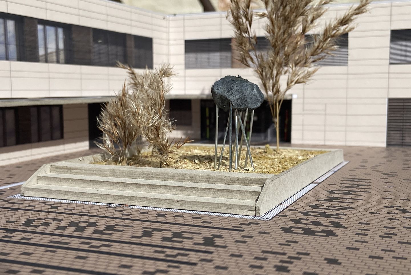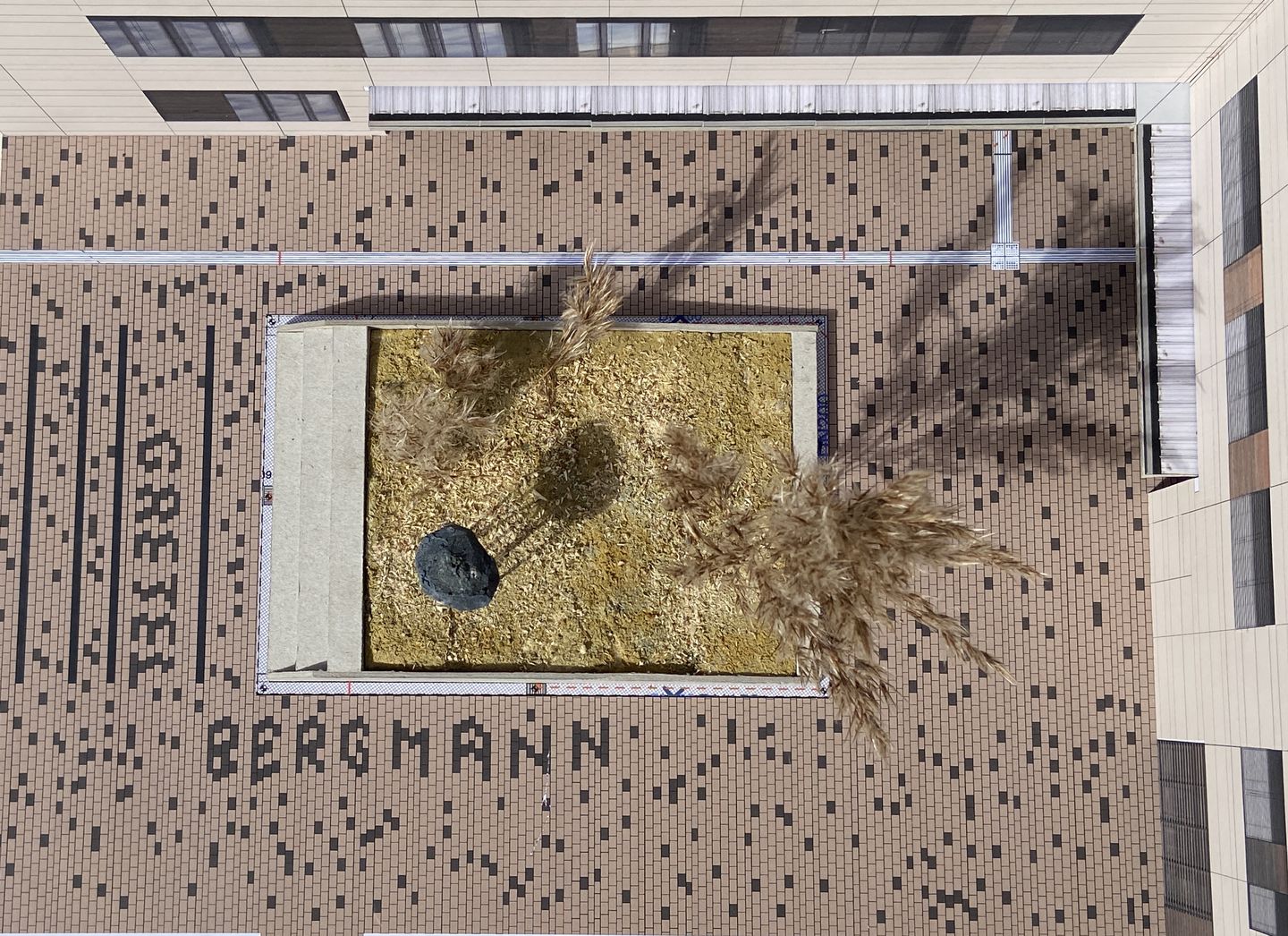 Die dritte Arbeit findet sich am Boden. Die Namensgeberin der Schule tritt durch die Umsetzung von circa 150 Pflastersteinen des Vorderhofs subtil in Erscheinung. Die zufällig wirkende Streuung heller und dunklerer Steine vor der Schule formt an einigen Stellen Buchstaben, die Steine bleiben jedoch in ihrem Verlegemuster großflächig. Subtil wird damit ihr Name geehrt und zum Teil der Plattform, die bewusst als Ebene beschritten werden kann, um zur Schule zu gelangen.