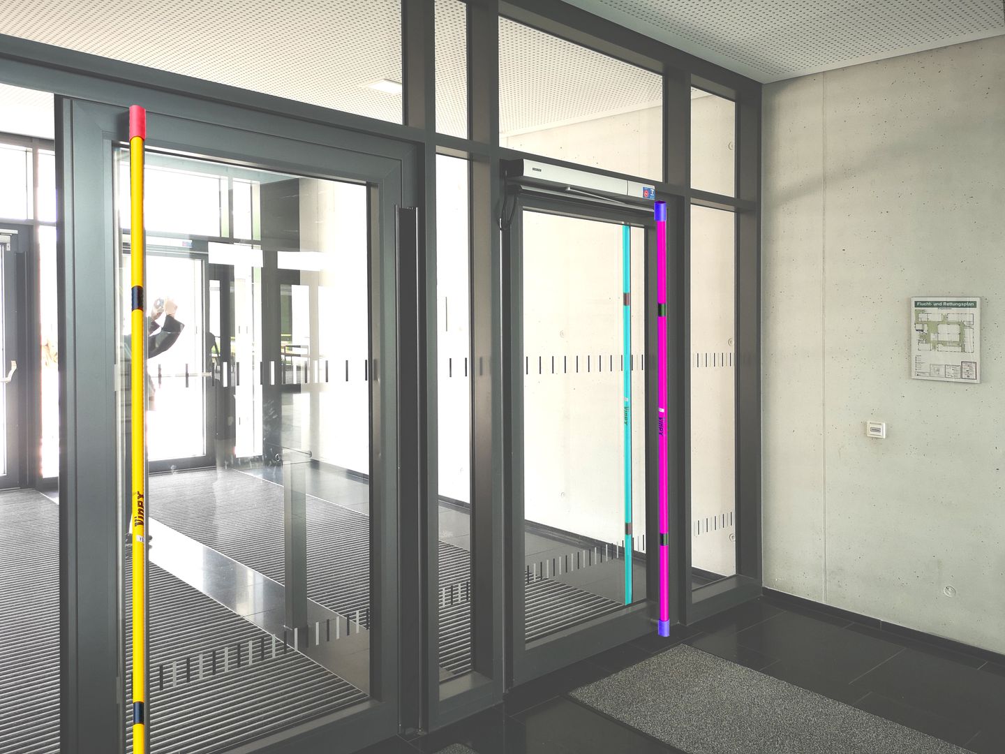 Der Einsatz von Hochsprunglatten als Ersatz für Türgriffe lenkt die Aufmerksamkeit auf die Eingänge. Sie anzufassen, um in die Schule zu gelangen, lädt auch dazu ein, sich mit ihnen auseinanderzusetzen und darüber mit der Geschichte Gretel Bergmanns. Ihre damalige Ausgrenzung vom Sport wird durch die Funktionsverschiebung der Hochsprunglatten als Türgriffe zum Eintreten umgekehrt. Aus der wackligen Waagerechten drehen sich die Latten in die Senkrechte und stehen fest installiert Spalier für die Besuchenden der Schule. „Die Installation schärft den Blick auf Andersartigkeit, auf Dinge, die nicht ganz zu ihrer Umwelt passen, sie dadurch aber bereichern. Akzeptanz dafür zu fördern, ist vielleicht eine der wichtigsten Aufgaben, die wir an einer Schule tun können“, so Ulrich.