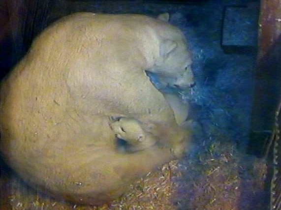 Da beim Füttern schwaches Licht in die Höhle gelangt, kann die Gehegekamera erstmals auch farbige Bilder und nicht nur schwarz-weiße Infrarot-Fotos liefern. Bis Besucherinnen und Besucher die beiden Eisbären live sehen können, werden aber noch ein paar Wochen vergehen. Eisbärin Vera wird mit ihrem Nachwuchs frühestens Anfang März 2015 die Wurfhöhle verlassen. tom