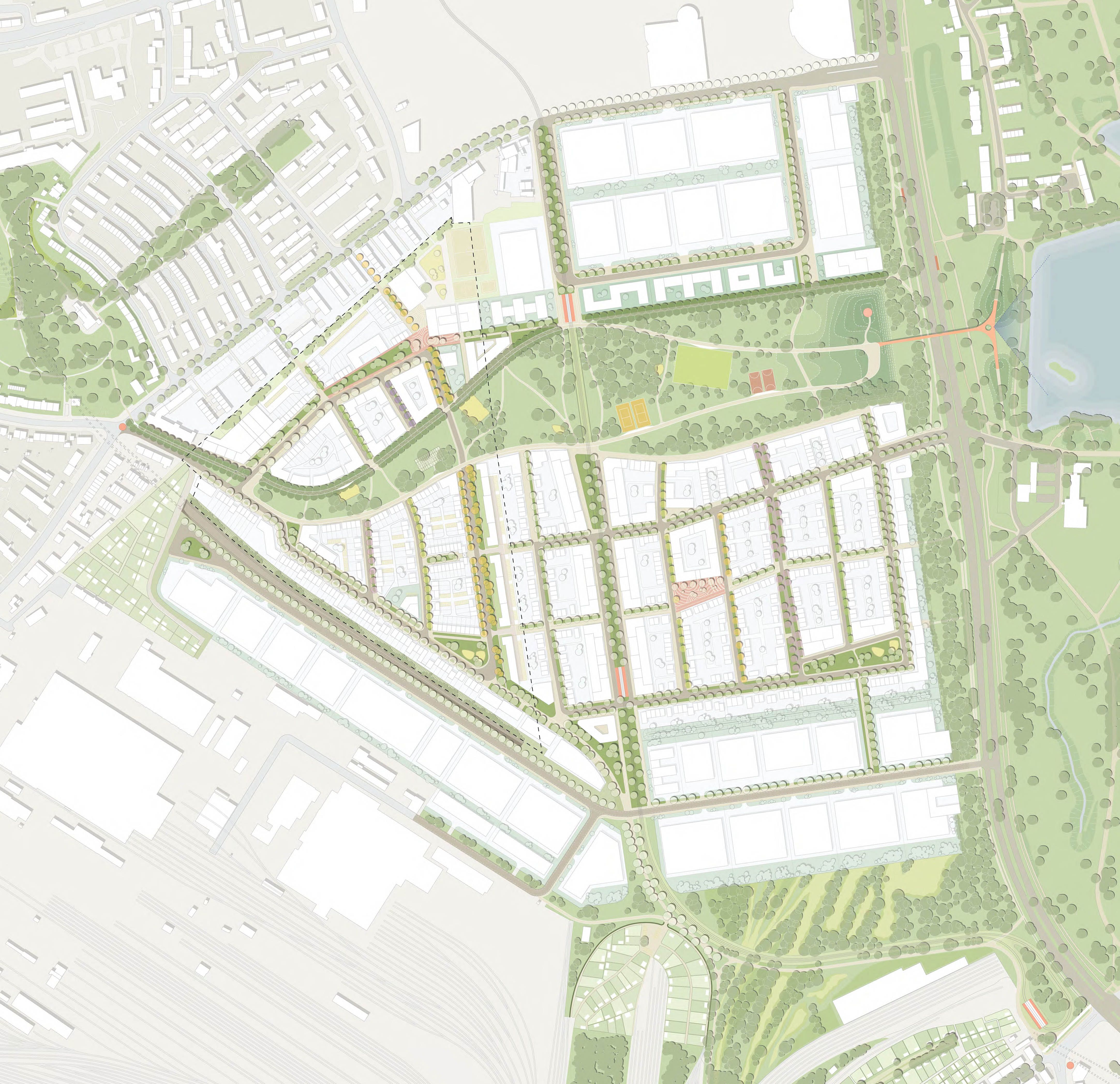 Wettbewerb Brunecker Straße, Gesamtentwurf Variante Schwerpunkt Wohnen Wettbewerbsarbeit West 8: Der Entwürf von West 8 sieht viel Grün vor. In der Mitte des neuen Quartiers von insgesamt circa 90 Hektar soll ein großer Quartierspark entstehen, darum herum werden sich Wohn - und Gewerbeflächen gruppieren.