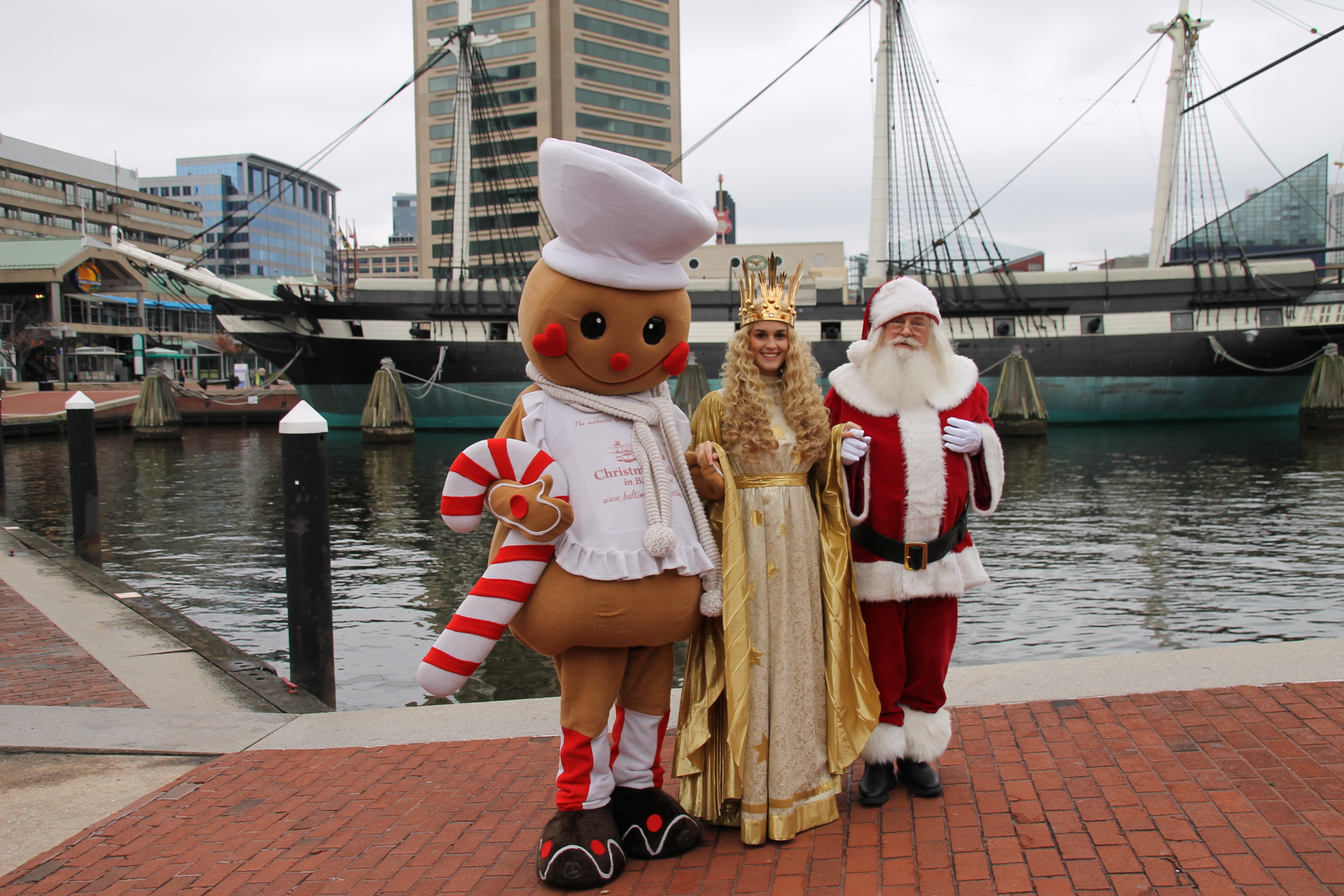 Das Christkind wird im Inner Harbour von Baltimore von Santa Claus und dem Lebkuchemann "Gingerman" abgeholt. Gemeinsam spazieren sie zum nahegelegenen Weihnachtsmarkt