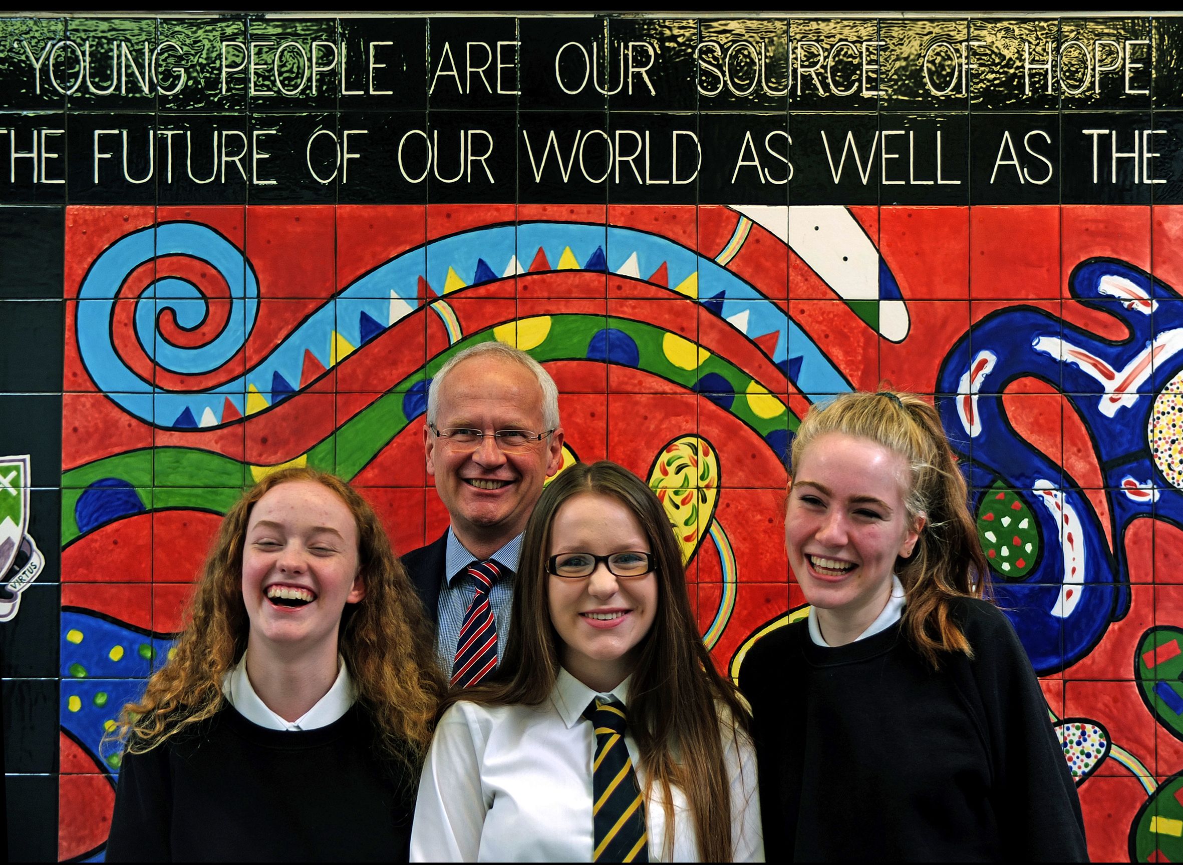 Delegationsreise im Zuge des Projekts "Strategische Partnerschaft Glasgow - Maastricht - Nürnberg" zum Thema "Übergang Schule - Beruf" in Nürnbergs schottische Partnerstadt Glasgow: Schulbürgermeister Dr. Klemens Gsell bei seinem Besuch der Shawlands Academy Glasgow mit Teilnehmerinnen des Nürnberger Austausches mit der Partnerschule Martin Behaim Gymnasiums Nürnberg.