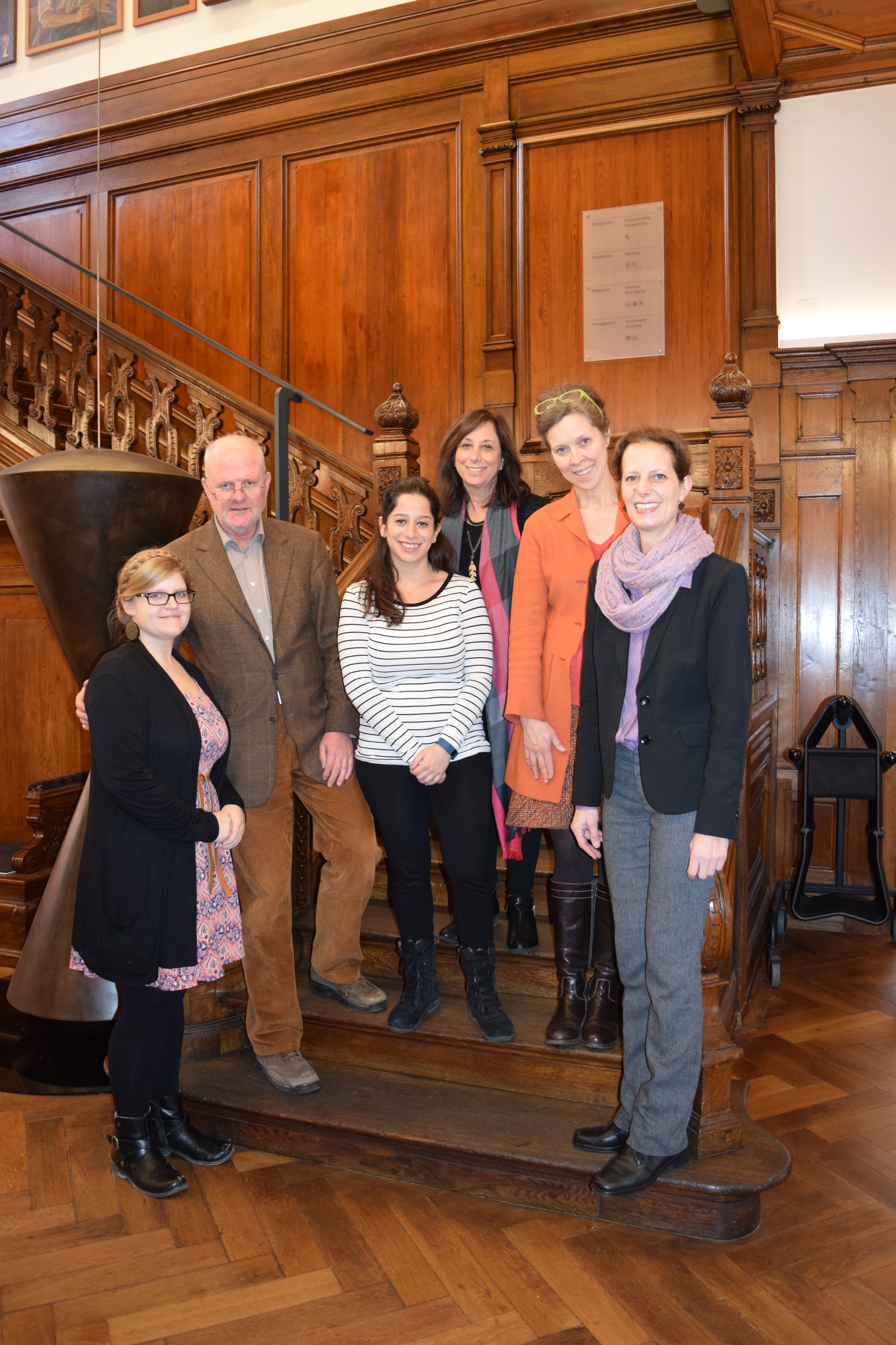 Besuch der Nachfahren der Kunstvilla-Erbauer Emil und Lilly Hopf. Von links nach rechts: Cornelia Baier (Praktikantin Kunstvilla), Manfred Faust (ehem. Archivar), Hilary Kesner (Enkelin von Ellen Großmann-Hopf), Janet Kesner (Tochter von Ellen Großmann-Hopf), Karin Johnson (Heimat- und Kulturverein Hürth), Dr. Andrea Dippel (Leiterin Kunstvilla).