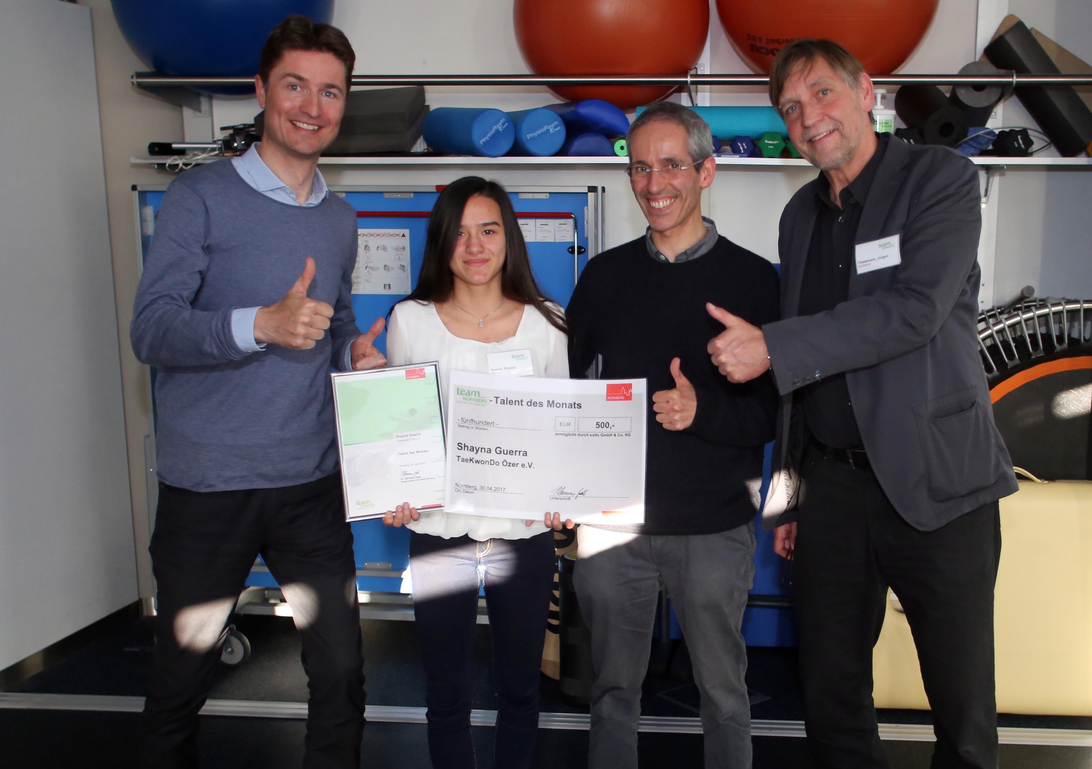 Team Nürnberg prämiert die Taekwondo-Sportlerin Shayna Guerra zum Talent des Monats April 2017 (v.li. Jochen Hauser, Geschäftsführer von exito GmbH & Co. KG, Shayna Guerra, Alfred Castano, Betreuer vom Verein Taekwondo Özer e.V., Jürgen Thielemann, Leiter des SportService der Stadt Nürnberg)