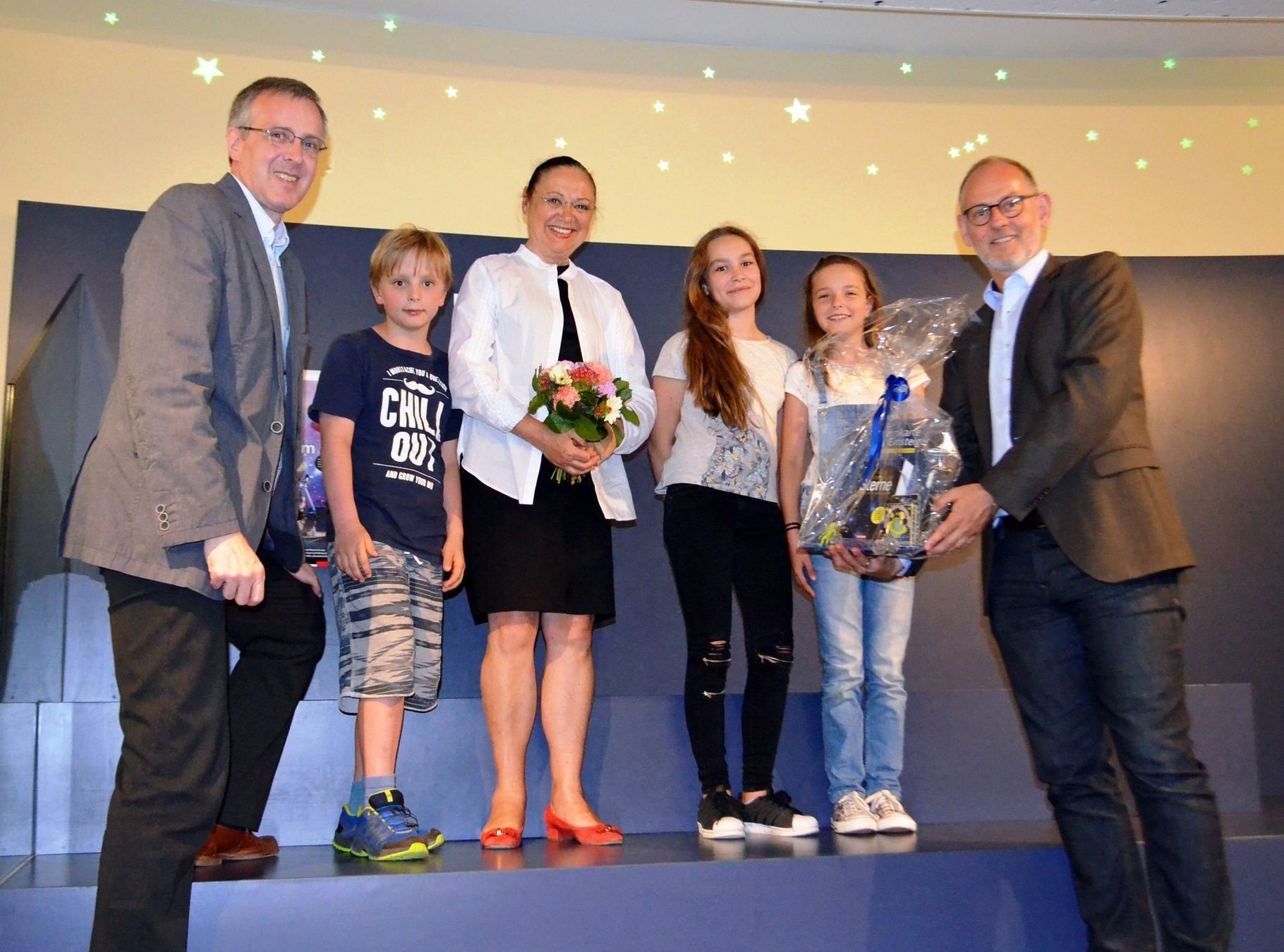 Barbara Müller (3.v.l.) mit ihren Enkelkindern Tom (2.v.l.), Fanny (3.v.r.) und Rosalie Müller (2.v.r.) sowie Dr. Klaus Herzig, Leiter des Planetariums (1.v.l.), und Dr. Martin Ecker, Direktor des Bildungszentrums (1.v.r.).