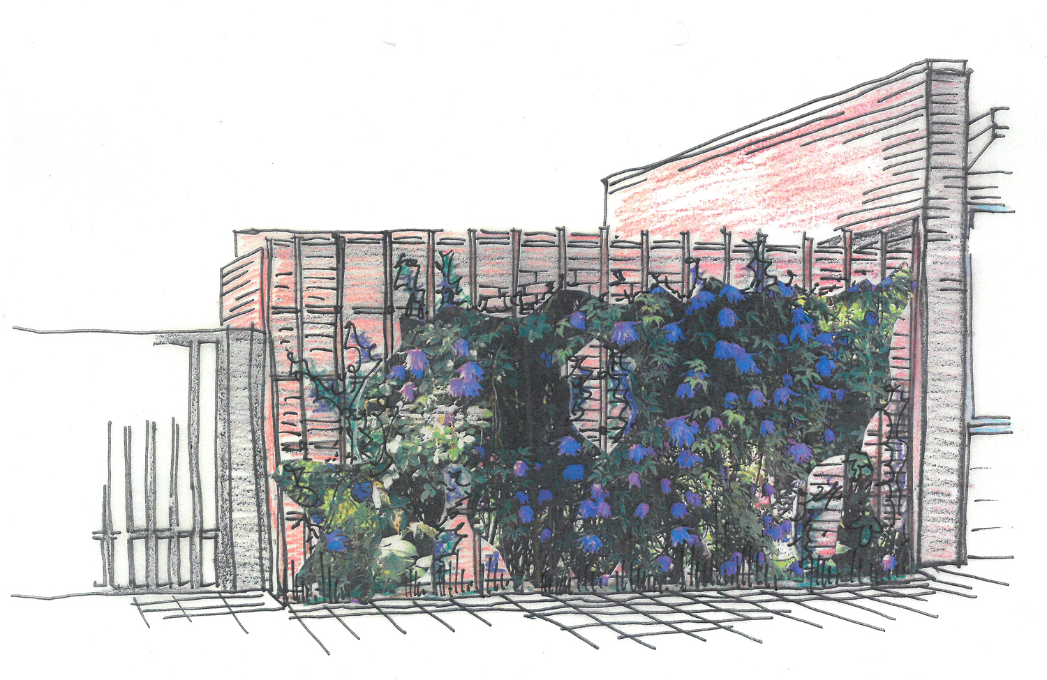 Skizze der Fassadenbegrünung mit Ramblerrosen am Marktamt