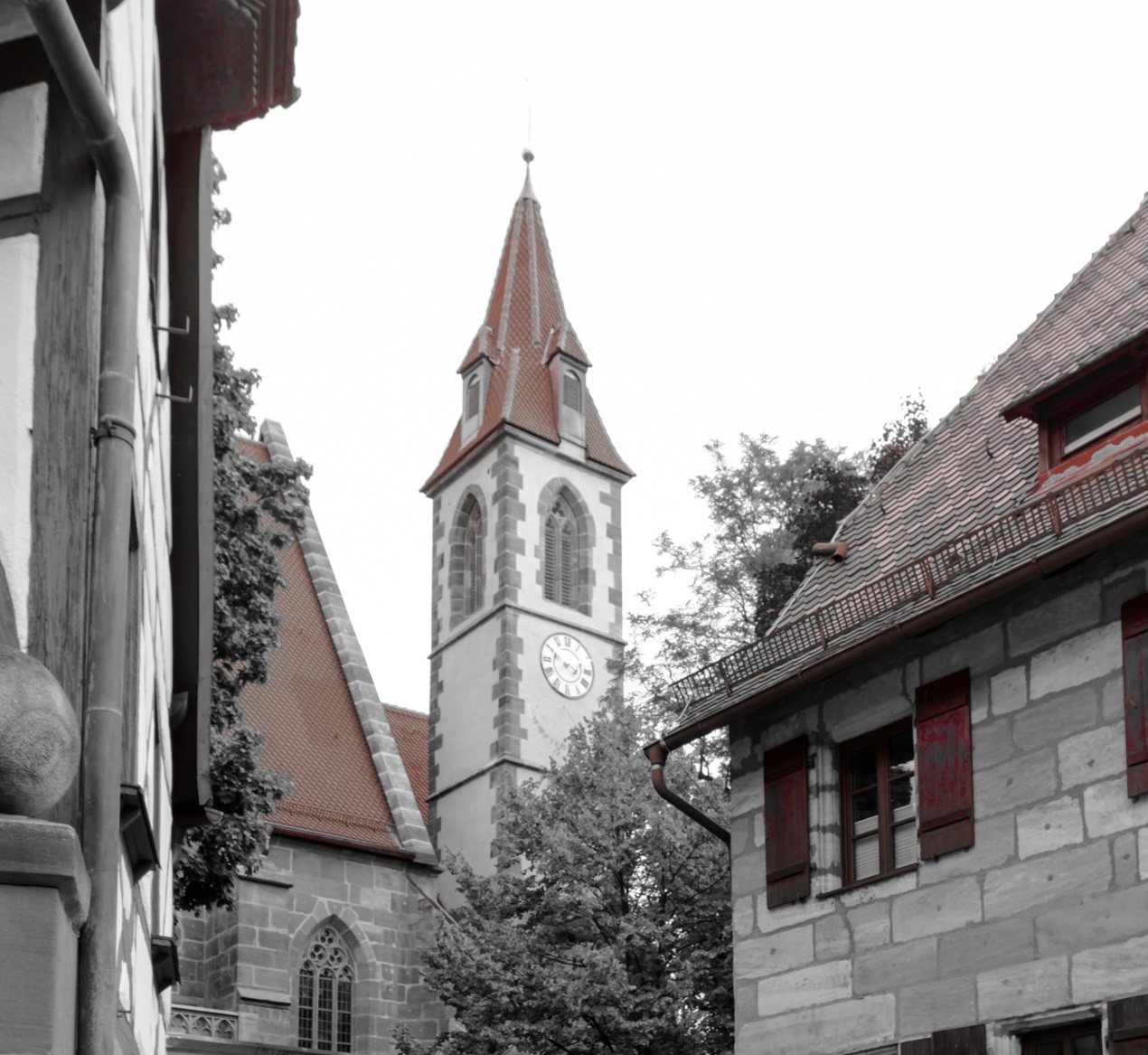 Kirche St. Nikolaus und St. Ulrich mit Turmuhr.