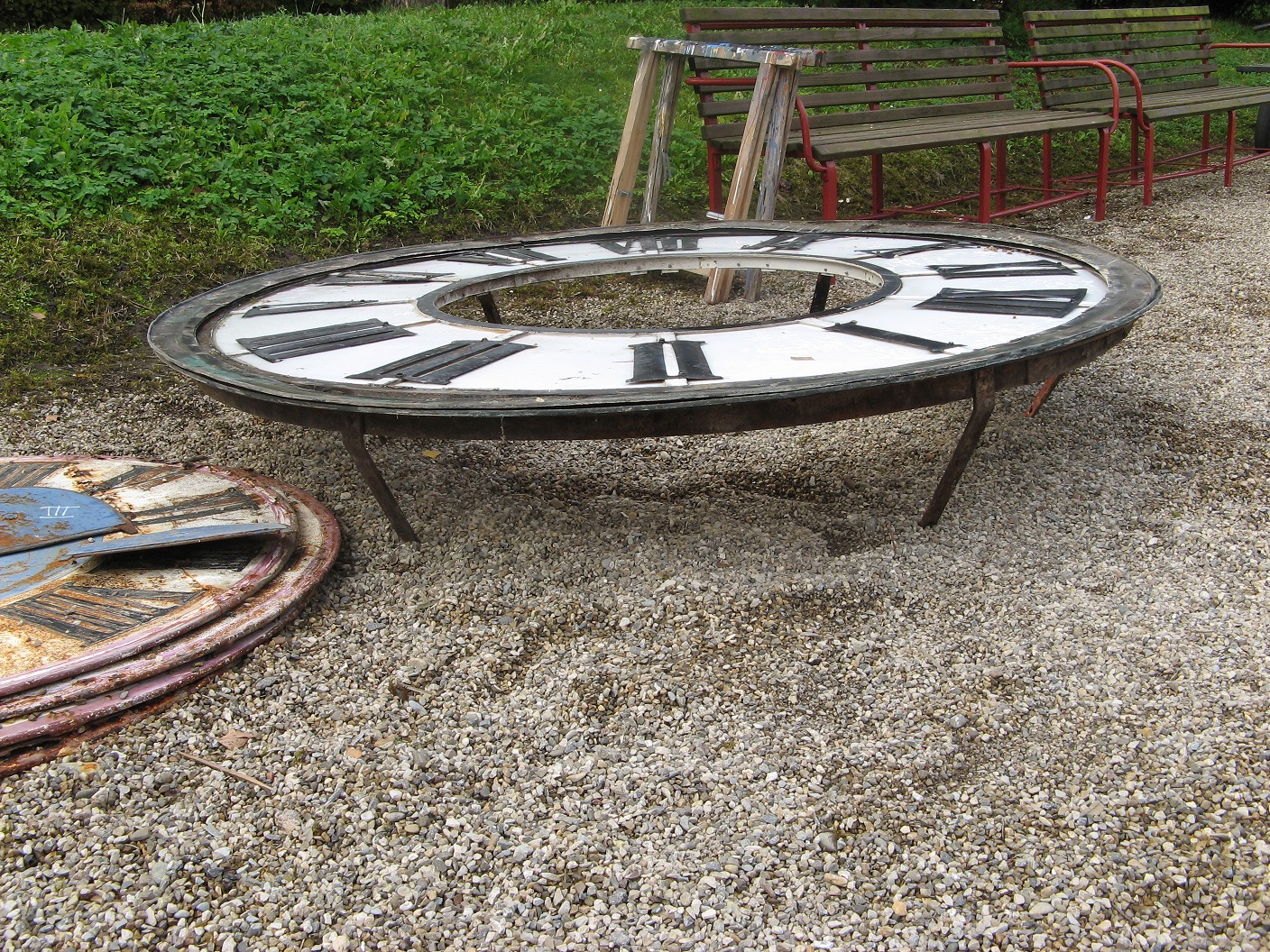 Ziffernblatt mit Teil des verwitterten Uhrenrahmens.
