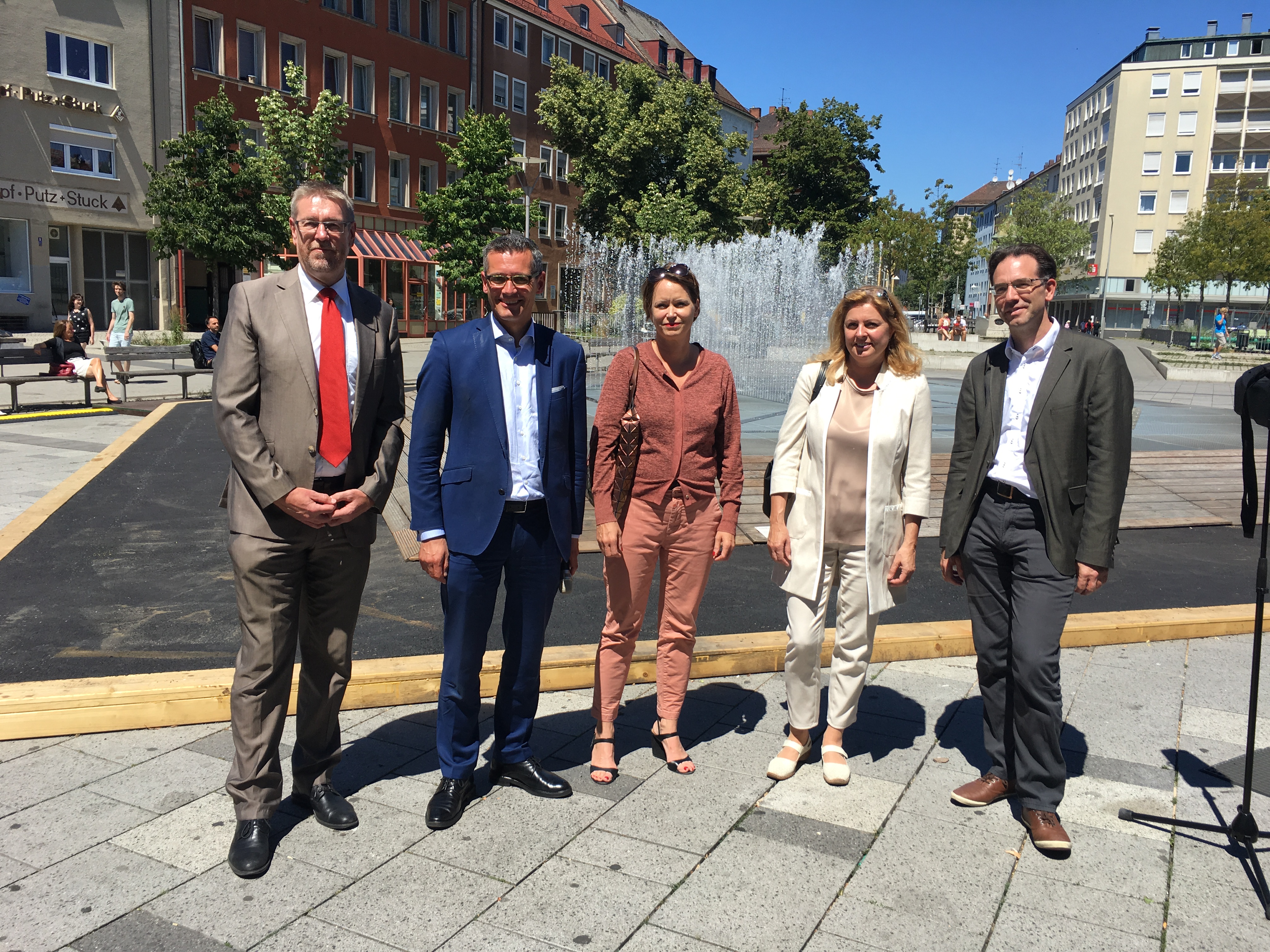 Inbetriebnahme des Jeppe-Hein-Brunnens mit Ronald Höfler, Sör, Dr. Michael Fraas, Wirtschaftsreferent Stadt Nürnberg, Dr. Eva Kraus, Direktorin Neues Museum, Martina Paasch, Vorstand N-Ergie und Daniel Ulrich, Baureferent Stadt Nürnberg (v.l.n.r.)