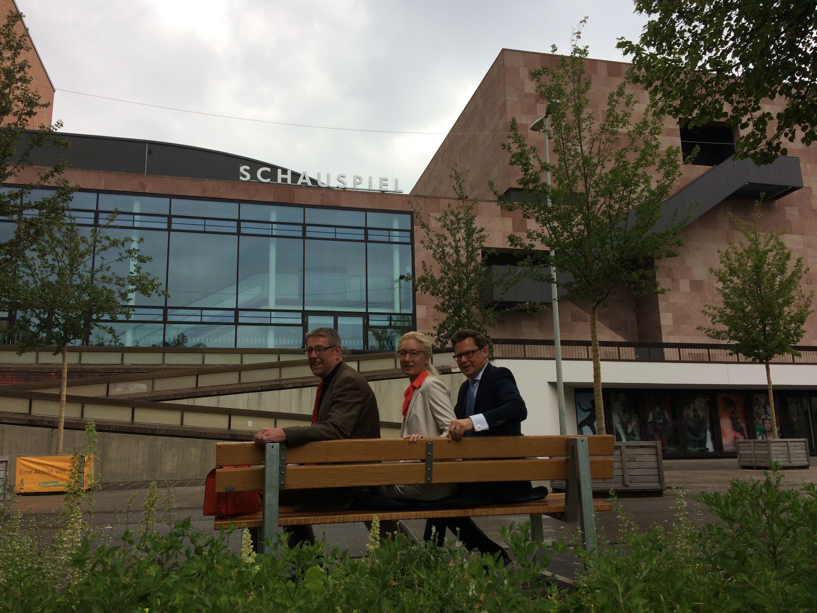 Der Karl-Pschigode Platz am Tag der Einweihung am 10. Juli 2018: Sör-Werkleiter Ronald Höfler, Daniela Bock vom Landschaftsarchitektur-Büro Grosser-Seeger & Partner, und der geschäftsführende Direktor des Staatstheaters, Christian Ruppert (von links nach rechts).
