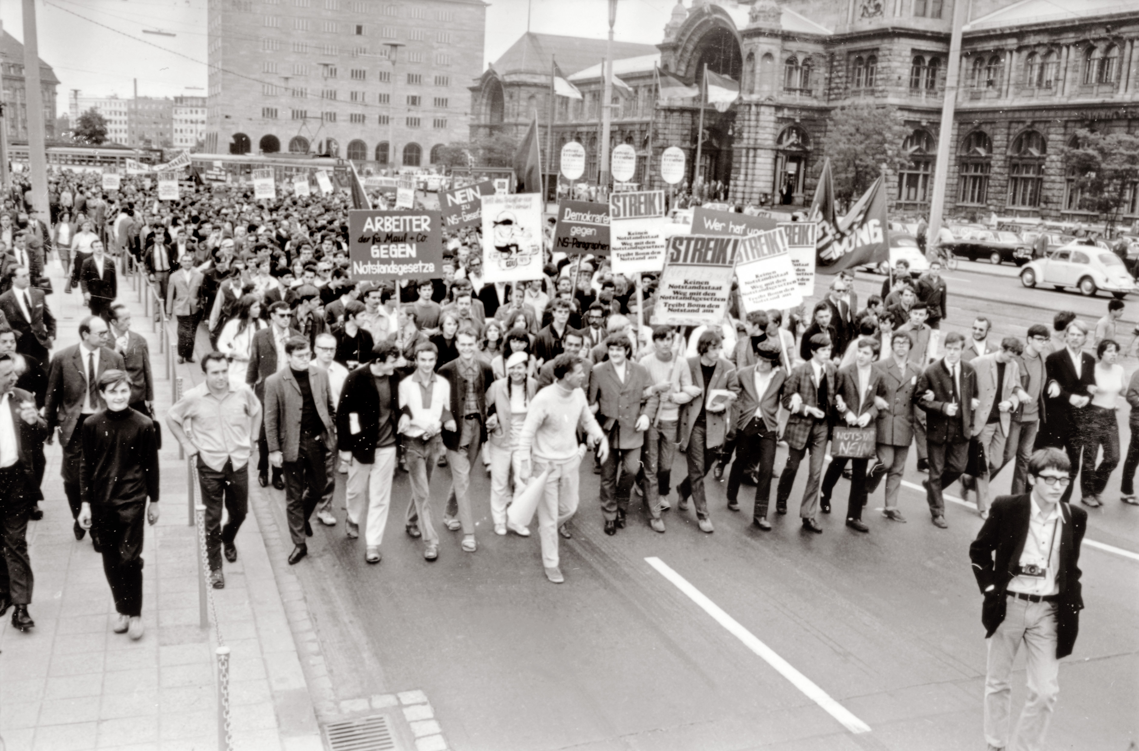 Jugendliche demonstrieren vor dem Hauptbahnhof gegen die Notstandsgesetze, Mai 1968. Foto: Stadtarchiv Nürnberg