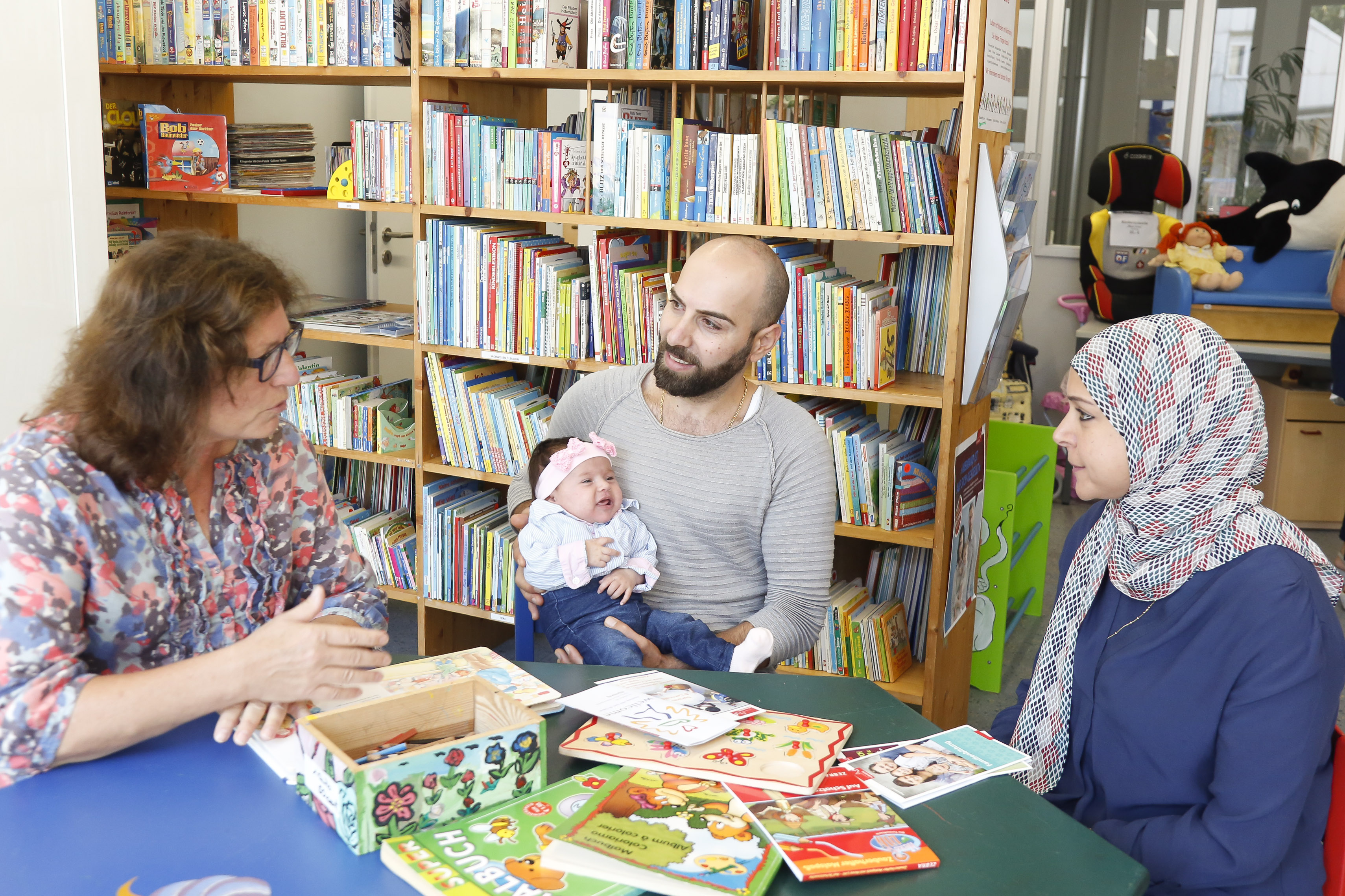 Maria Roth, Leiterin Südstadtforum Service und Soziales, berät eine Familie in der Einrichtung „Alles rund ums Kind“.