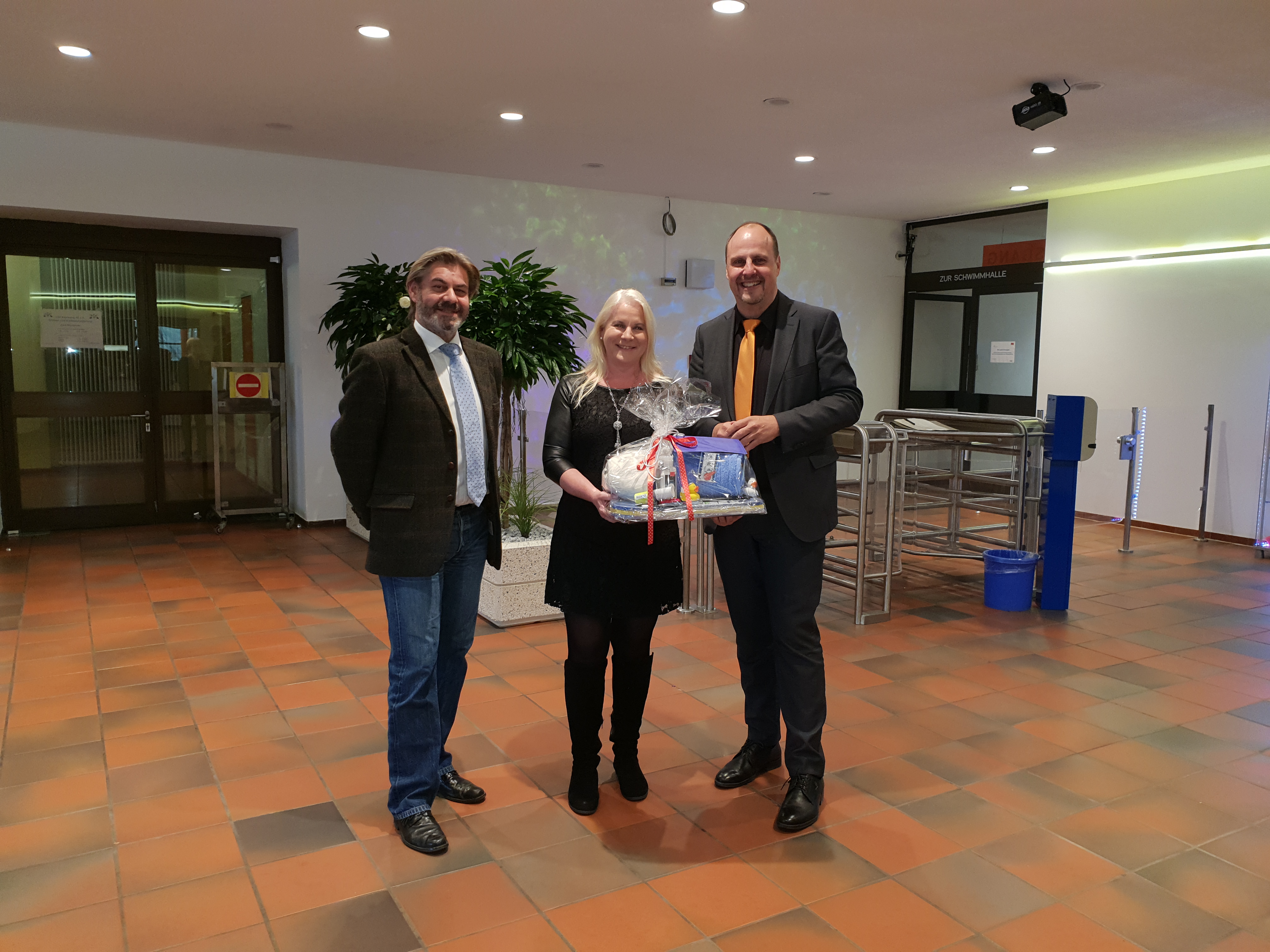Der Zweite Werkleiter von NürnbergBad, Gerhard Albert (links), und Bürgermeister Christian Vogel (rechts) überreichten einen Präsentkorb an die millionste Besucherin der Nürnberger Bäder, Monika Teriet.