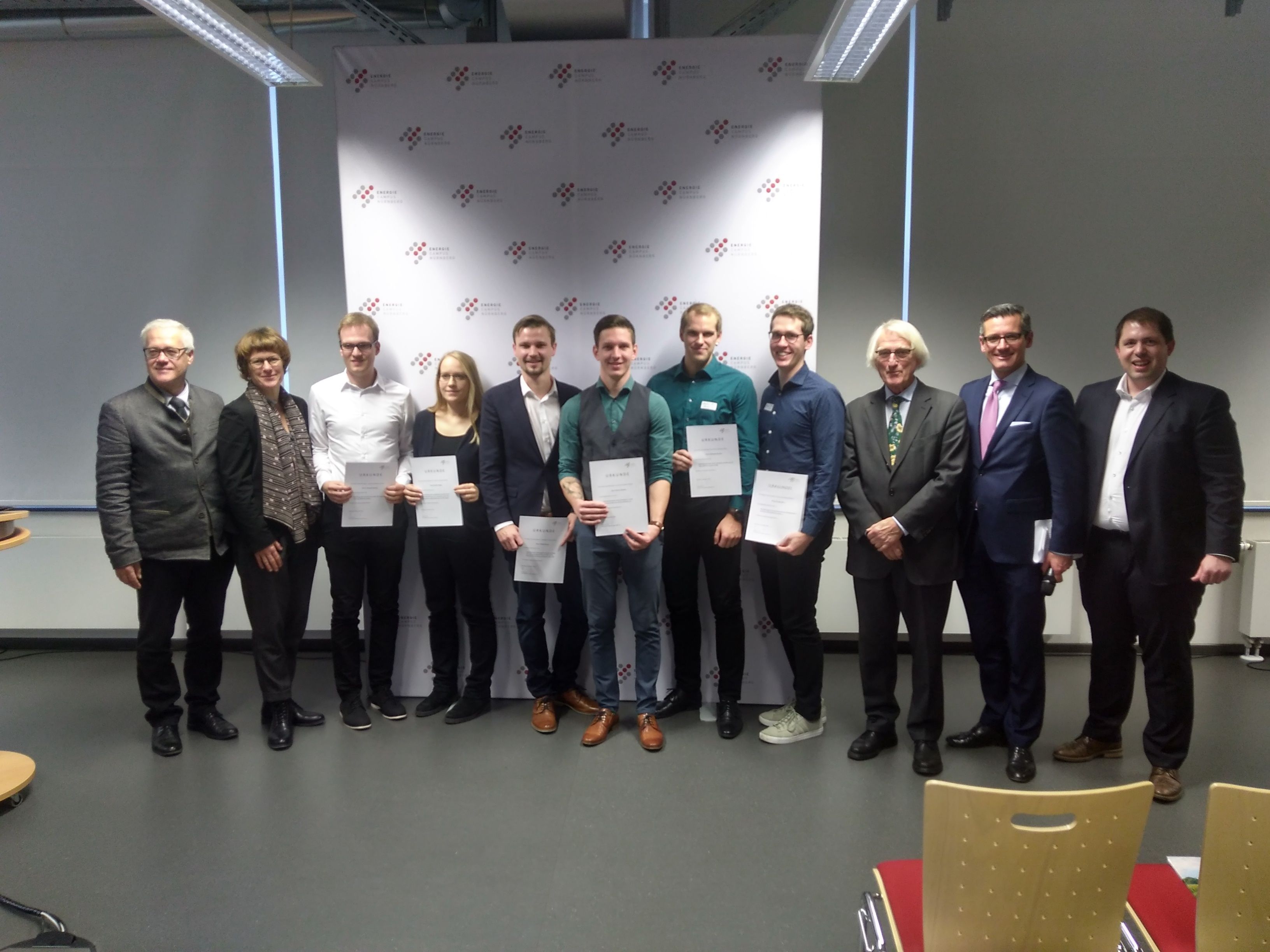 Ausgezeichnet für ihre Bachelor- und Masterarbeiten wurden Daniela Sappa (Technische Hochschule Nürnberg Georg Simon Ohm) im Bereich Effizienz (hochwärmedämmende Mörtel), Marco Blasius (Friedrich-Alexander-Universität Erlangen-Nürnberg) im Bereich Speicher (chemische Energiespeicherung), Christian Novak (Friedrich-Alexander-Universität Erlangen-Nürnberg) für Forschung an Energiemanagement-Technologien (Leistungselektronik), Florian Pol (Friedrich-Alexander-Universität Erlangen-Nürnberg) im Bereich Netze (Batteriespeicher), Philipp Runge (Friedrich-Alexander-Universität Erlangen-Nürnberg) für Untersuchungen im Energiemarktdesign (Potenzialstudie zur chemischen Wasserstoffspeicherung) und Sebastian Strohm (Bayerisches Zentrum für Angewandte Energieforschung) für die Entwicklung erneuerbarer Energien (Photovoltaik).