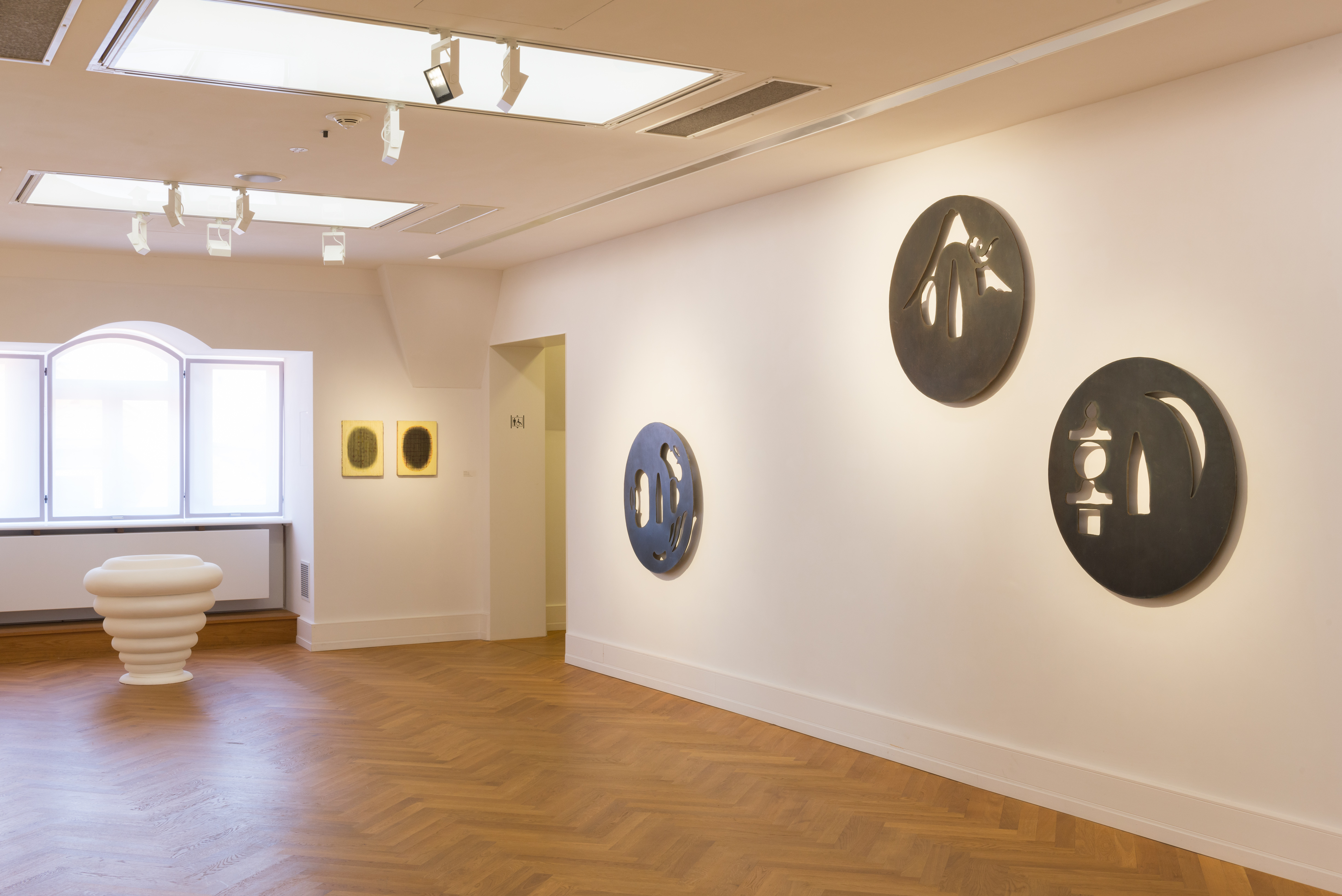 Von links nach rechts: Hans Karl Kandel, Ohne Titel (Gefäß aus neun Teilen), 2005, Hartgips, 80 cm hoch, Sammlung Kunstvilla. Günter Paule, Schwarze Sonne,, 2008, Acryl auf Holz, 40 x 30 cm, Leihgabe des Künstlers. Günter Paule, Schwarze Sonne, 2007, Acryl auf Holz, 40 x 30 cm, Leihgabe des Künstlers. Hubertus Hess, Tsuba, 2008, Stahl, dreiteilig, , Ø je 90 cm, Leihgabe des Künstlers