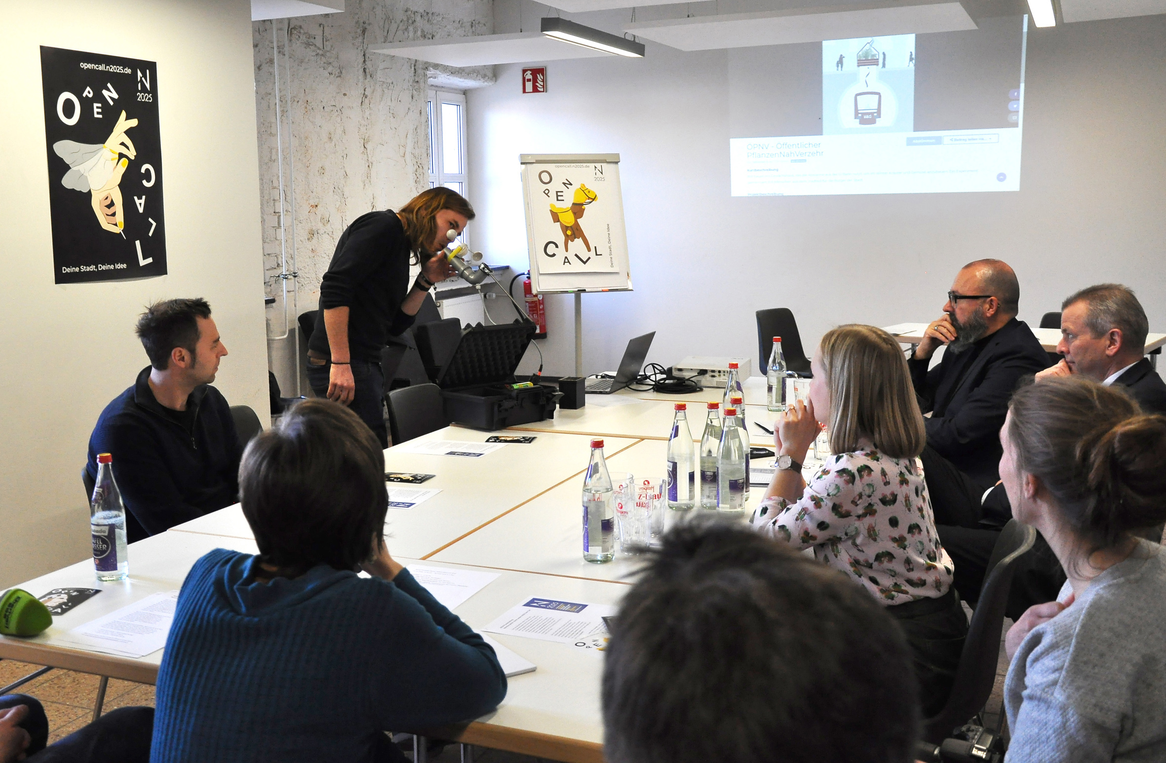 Uli Hirschmüller vom letztjährigen Gewinnerprojekt „ÖPNV - Öffentlicher PflanzenNahVerzehr“ stellt die Messstation vor, mit der die Bedingungen an diversen potentiellen Standorten geprüft werden sollen. Die Initiatoren des Projekts möchten ein Gewächshaus bauen, das die Abwärme der U-Bahn nutzt, um im Winter Kräuter und Gemüse anzubauen.