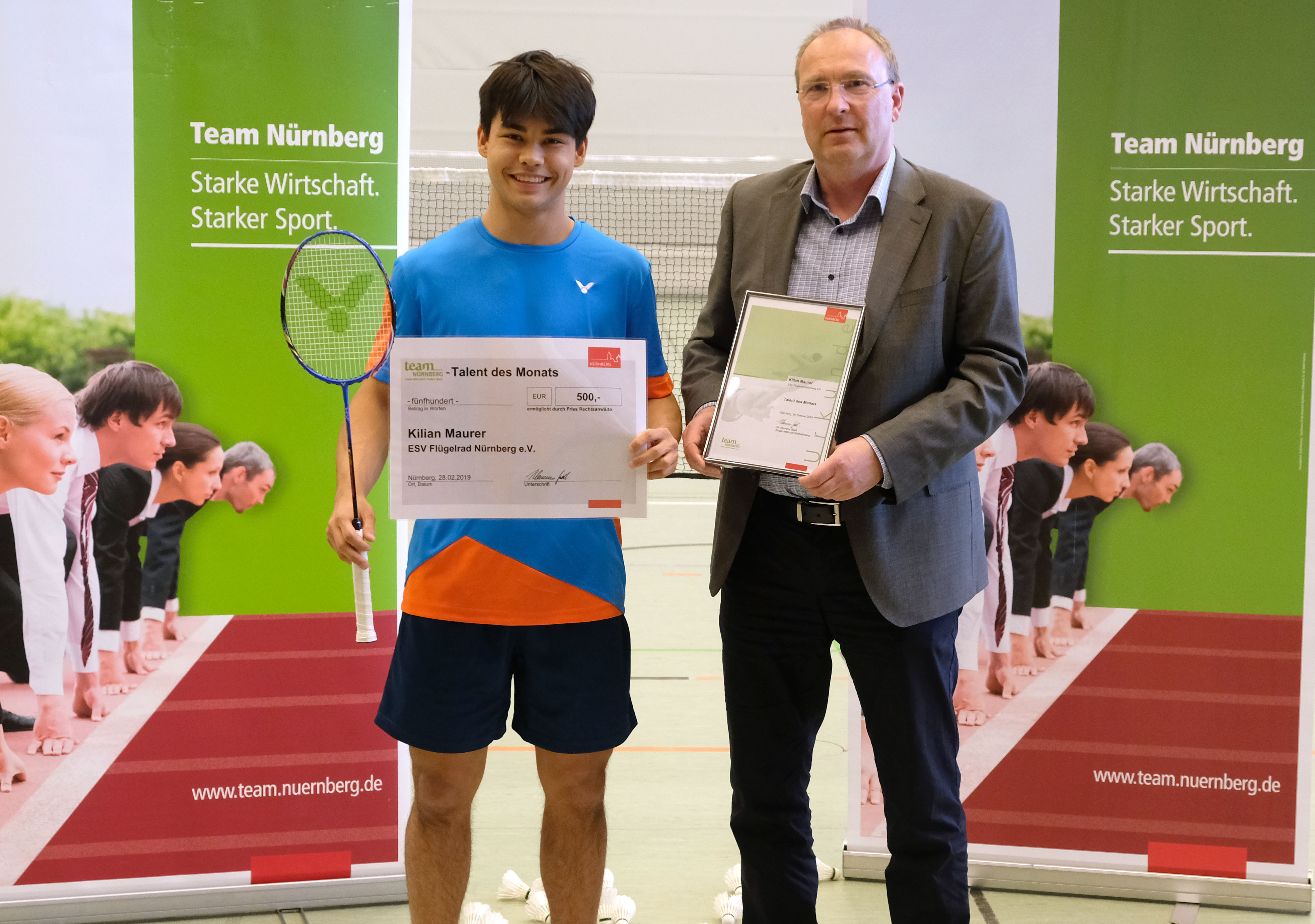 Die Förderinitiative Team Nürnberg konnte am Dienstag, 20. März 2019, einen ganz besonderen Sportler prämieren: Den 15-jährigen Kilian Maurer vom ESV Flügelrad Nürnberg e.V. Um seinem Traum, Profi-Badmintonsportler zu werden, näher zu kommen, ist Kilian im Alter von erst 13 Jahren von München nach Nürnberg ins Sportinternat gezogen – und besucht seitdem die Bertolt-Brecht-Schule, Nürnbergs Eliteschule des Sports.