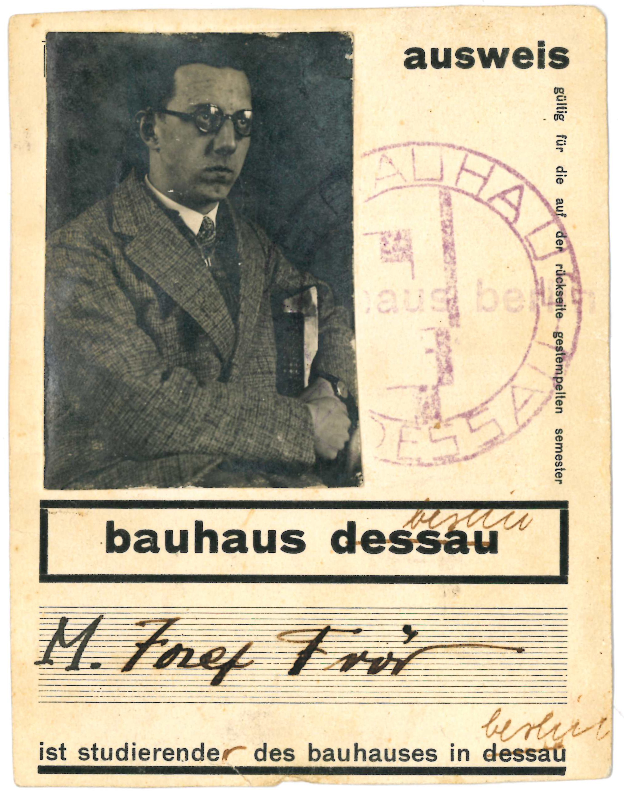 Studienausweis von Josef Frör. Josef Frör studierte am Bauhaus in Dessau, mit dem er 1932 nach Berlin umzog, unter anderem bei Ludwig Mies van der Rohe und Ludwig Hilberseimer.