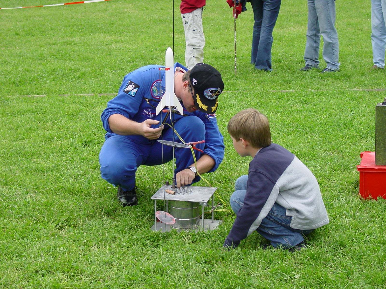 Kurt Rehberger startet eine Modellrakete am 1. Mai auf dem Erfahrungsfeld Nürnberg.
