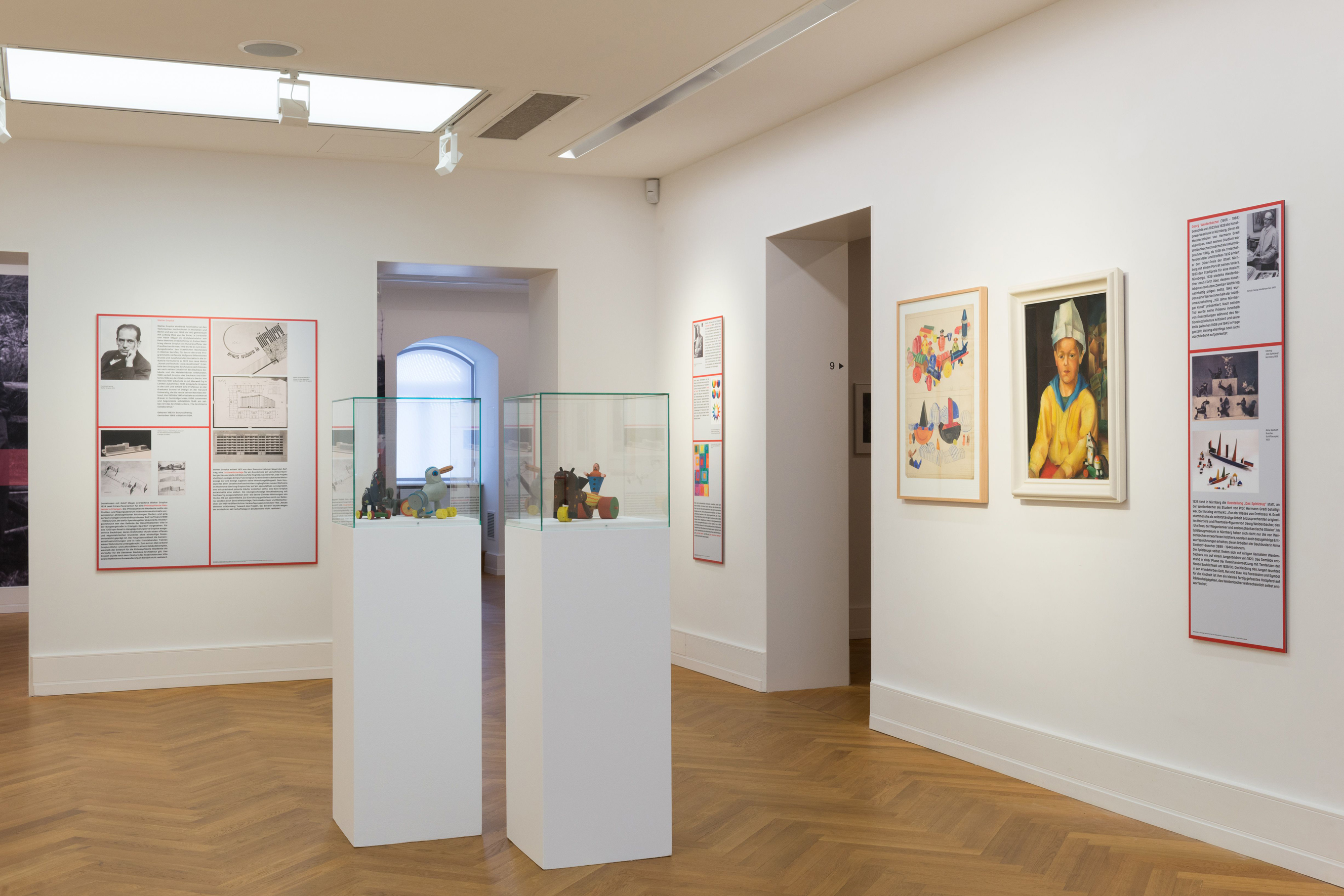 "Alle Werke Georg Weidenbacher (1905 – 1984): Entwurfszeichnung, um 1926, Aquarell und Bleistift auf Papier Junge mit Papiermütze, 1929, Öl auf Hartfaserplatte Präsentation in der linken Vitrine: Rädertier „Pferd“, um 1926 und Rädertier „Taube“, um 1926 Präsentation in der rechten Vitrine: Rädertier „Wagenlenker“, um 1926"