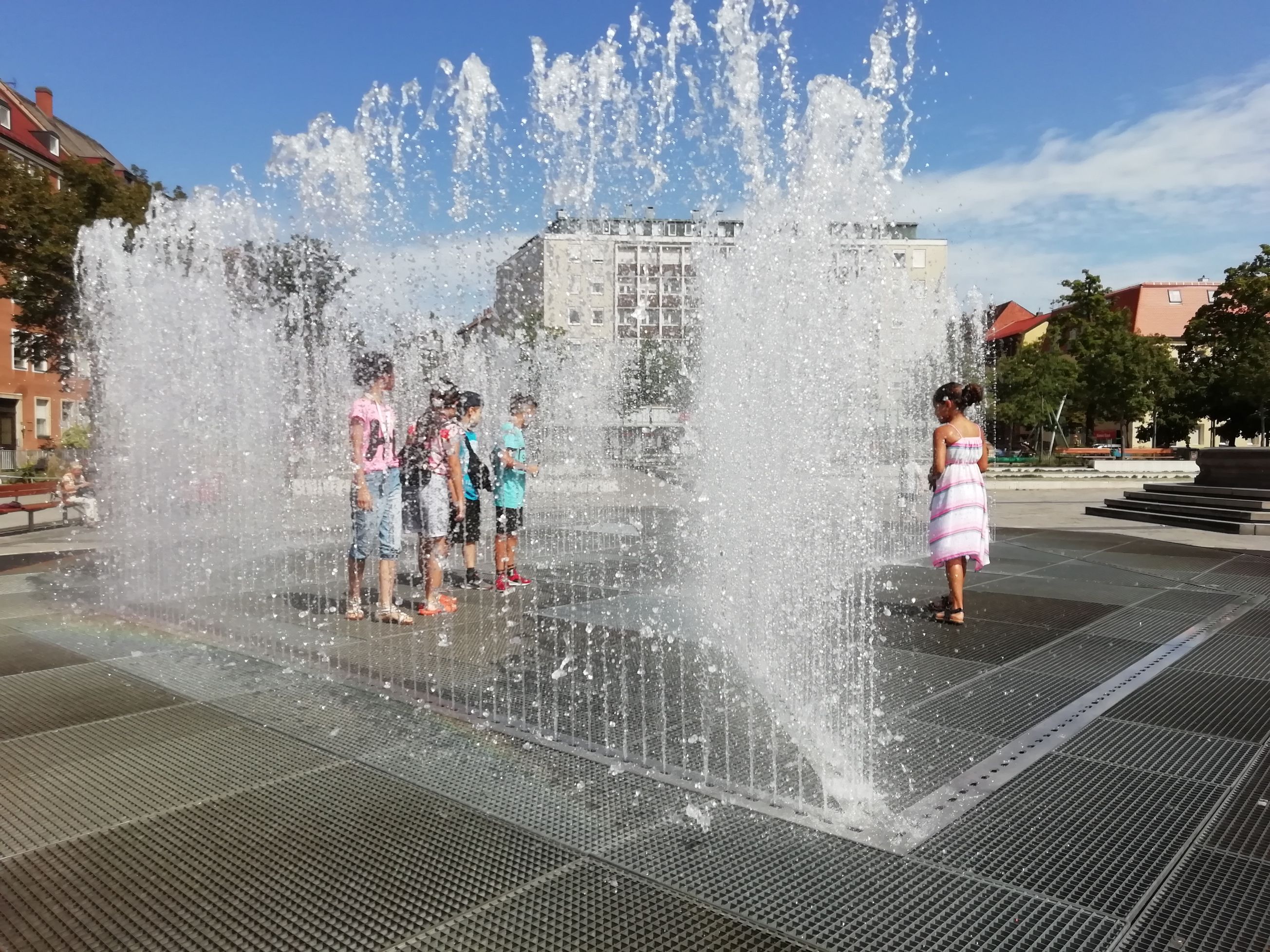 Bereits wenige Augenblicke nach der offiziellen Eröffnung des "Jeppe-Hein-Brunnens" vereinnahmten Kinder den Kunstbrunnen für sich als Spielplatz.
