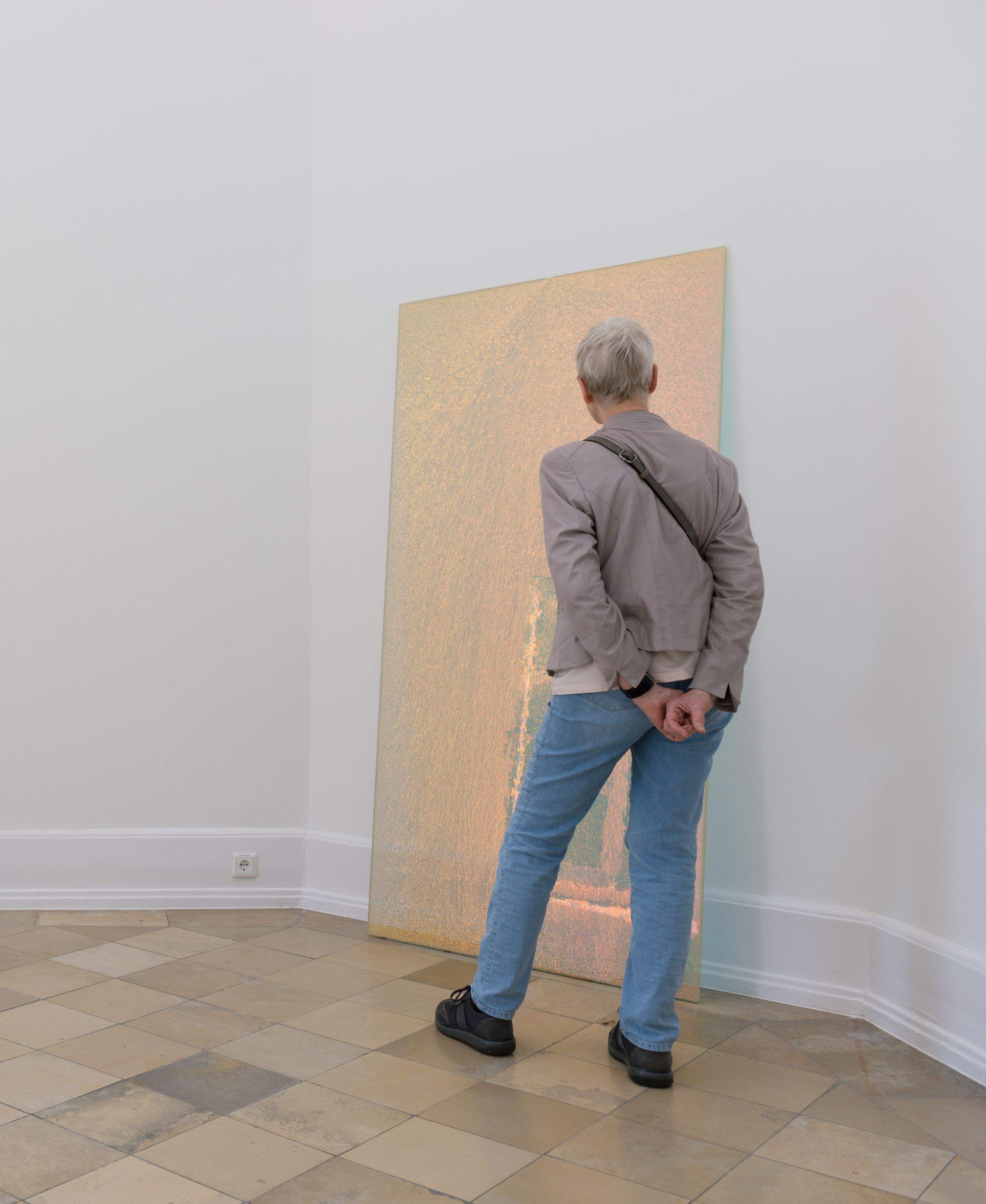 Eine Besucherin betrachtet Ann Veronica Janssens‘ „Magic Mirror Green“ in der Ausstellung „Hidden Beauty“. Courtesy Ann Veronica Janssens & Esther Schipper, Berlin; © VG Bild-Kunst Bonn, 2019.