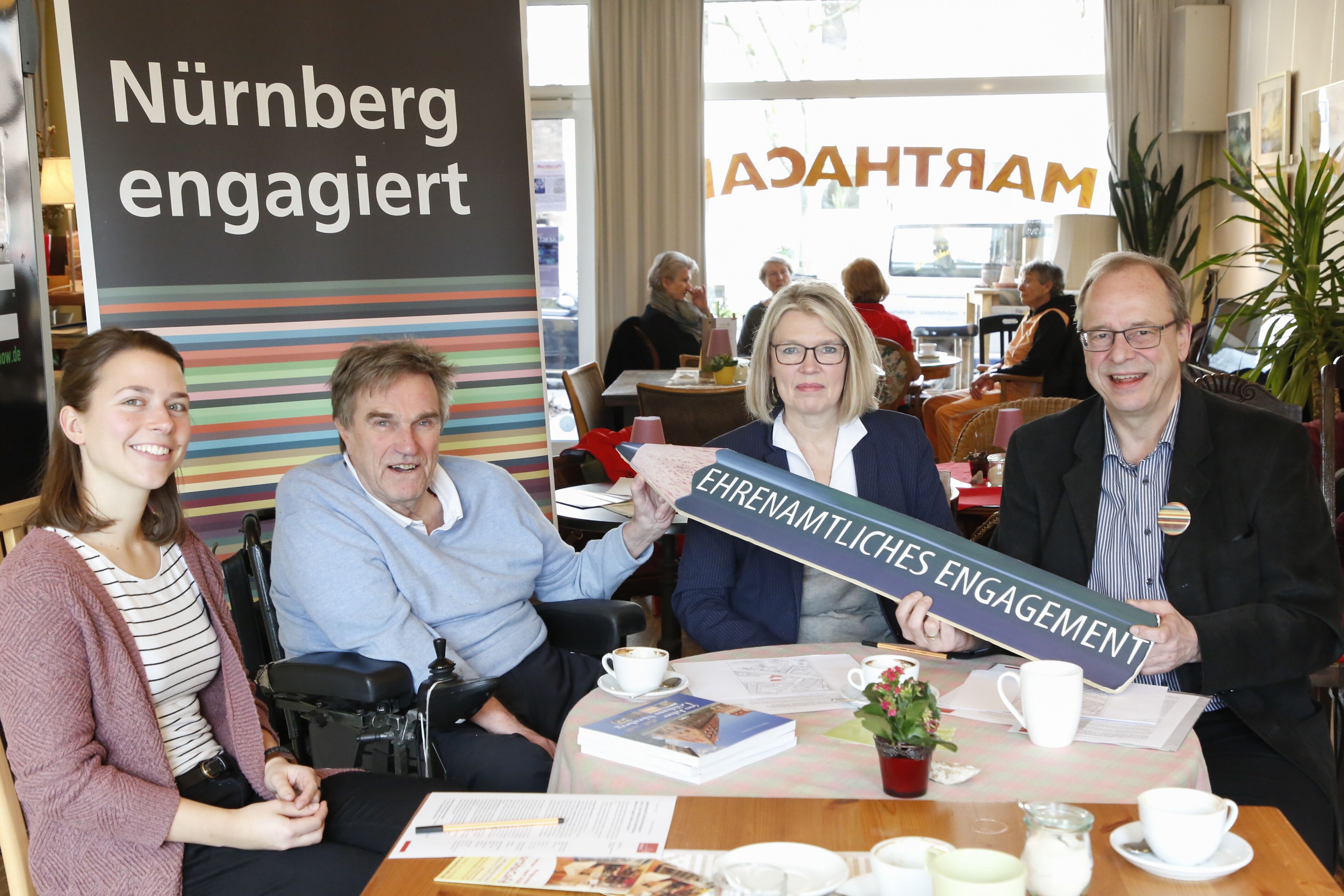 Lea Weimer, Sozialreferat der Stadt Nürnberg, Jochen Kapelle, Schatzmeister von Win e.V., Renate Backhaus, Vorstandsmitglied bei Win e.V., und Dr. Uli Glaser, Sozialreferat der Stadt Nürnberg, im Martha Café, einem der geförderten Projekte.