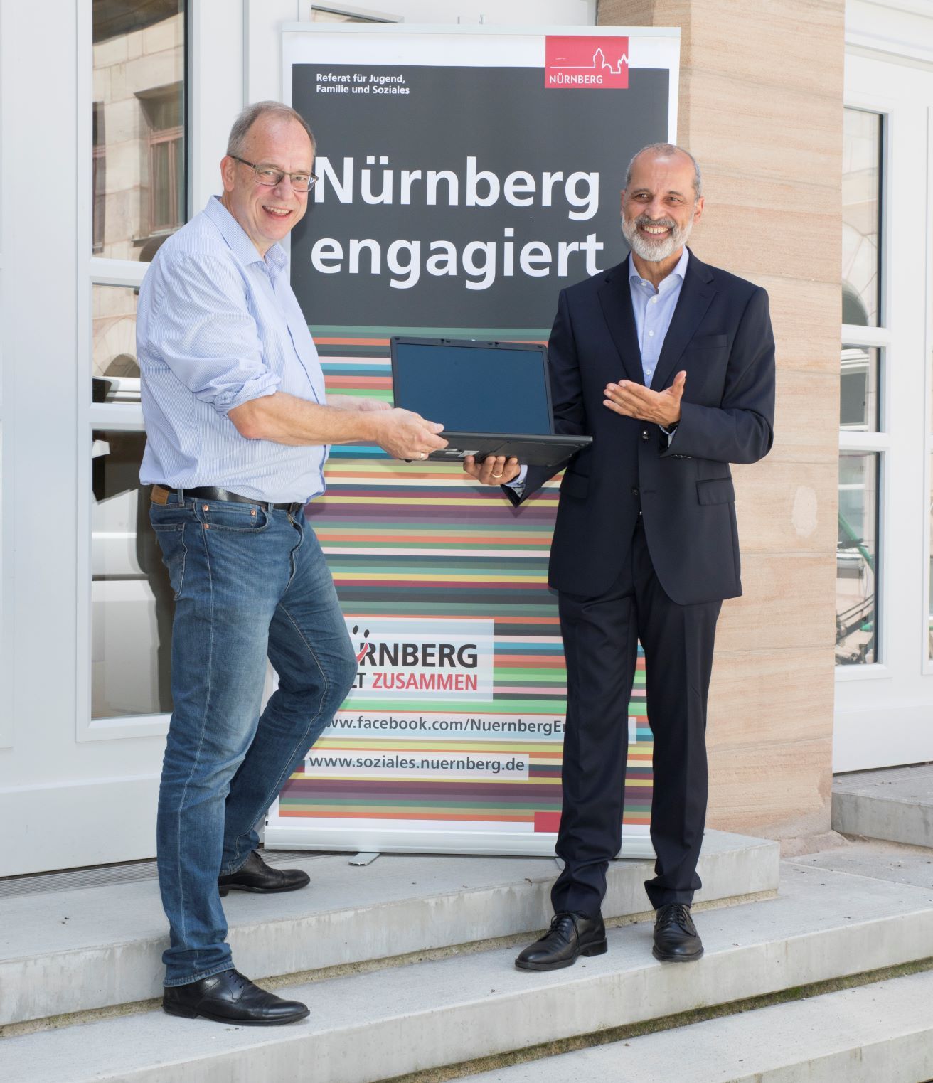 Der Leiter des Siemns-Regionalreferats Erlangen-Nürnberg, Michael Sigmund (rechts), übergab Laptops an Dr. Uli Glaser vom Sozialreferat der Stadt Nürnberg am 1. Juli 2020.