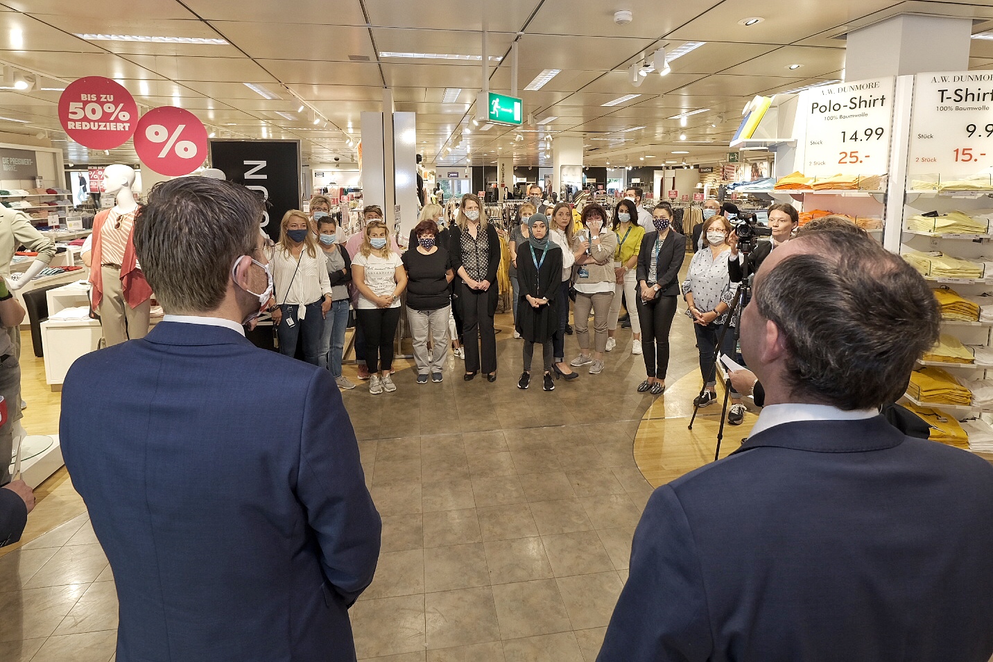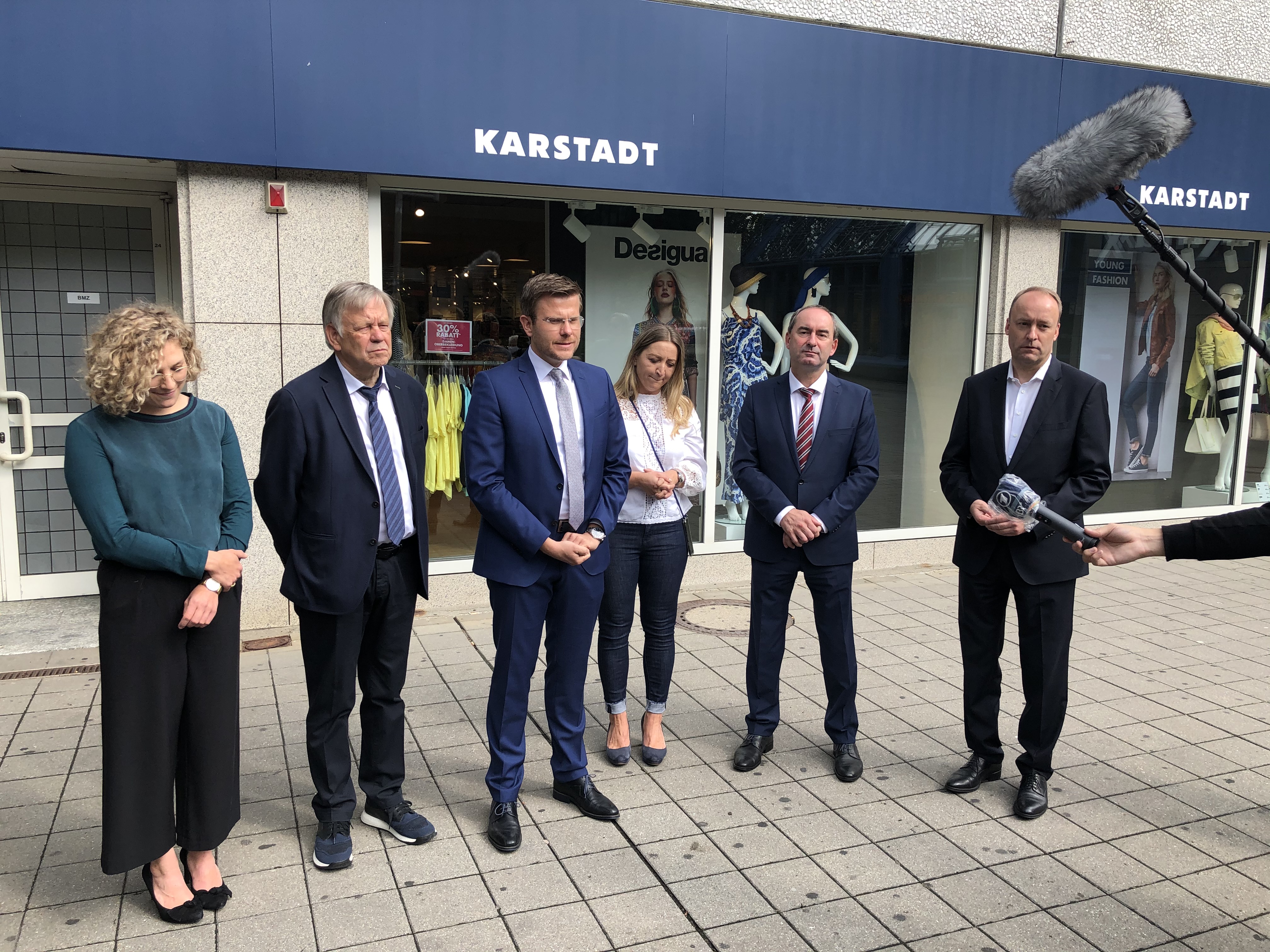 Bild Download: Jaana Hampel, verdi, Landtags-Vizepräsident Karl Freller, Oberbürgermeister Marcus König, Betriebsratsvorsitzende Katharina Lorenz, Wirtschaftsminister Hubert Aiwanger, Reinhard Haas, Galeria Karstadt