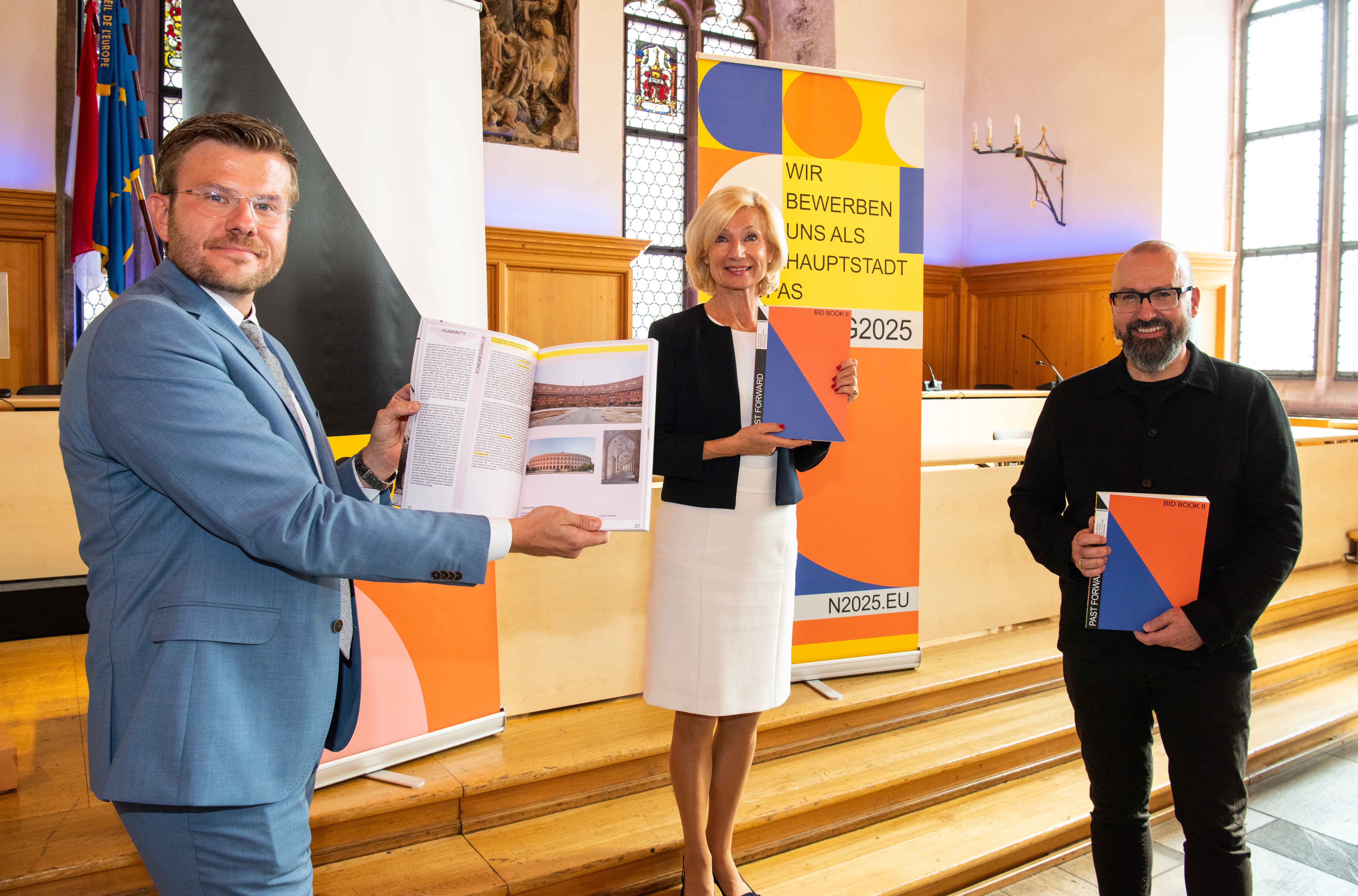Oberbürgermeister Marcus König, Kulturbürgermeisterin Prof. Dr. Julia Lehner und der Leiter des Bewerbungsbüros Kulturhauptstadt Europas 2025, Prof. Dr. Hans-Joachim Wagner, stellen am 21. September 2020 im Historischen Rathaussaal das zweite Bewerbungsbuch vor.