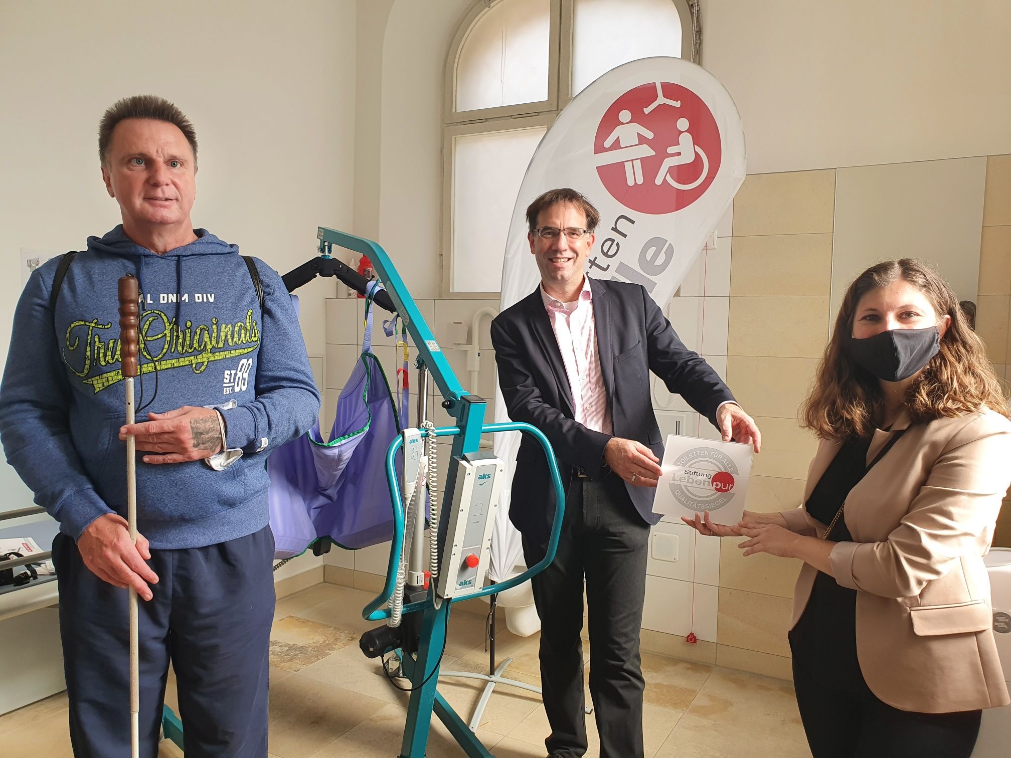 Nadine Held von der Stiftung Leben pur hat Daniel F. Ulrich, Planungs- und Baureferent der Stadt Nürnberg, am heutigen Mittwoch, 23. September 2020, das „Toiletten für alle“-Qualitätssiegel im Baumeisterhaus überreicht. Die Stiftung Leben pur mit Sitz in München arbeitet daran, für schwer- und mehrfachbehinderte Menschen Lösungen zur Erleichterung ihres Alltags zu finden und ihnen eine bessere Lebensqualität zu ermöglichen.