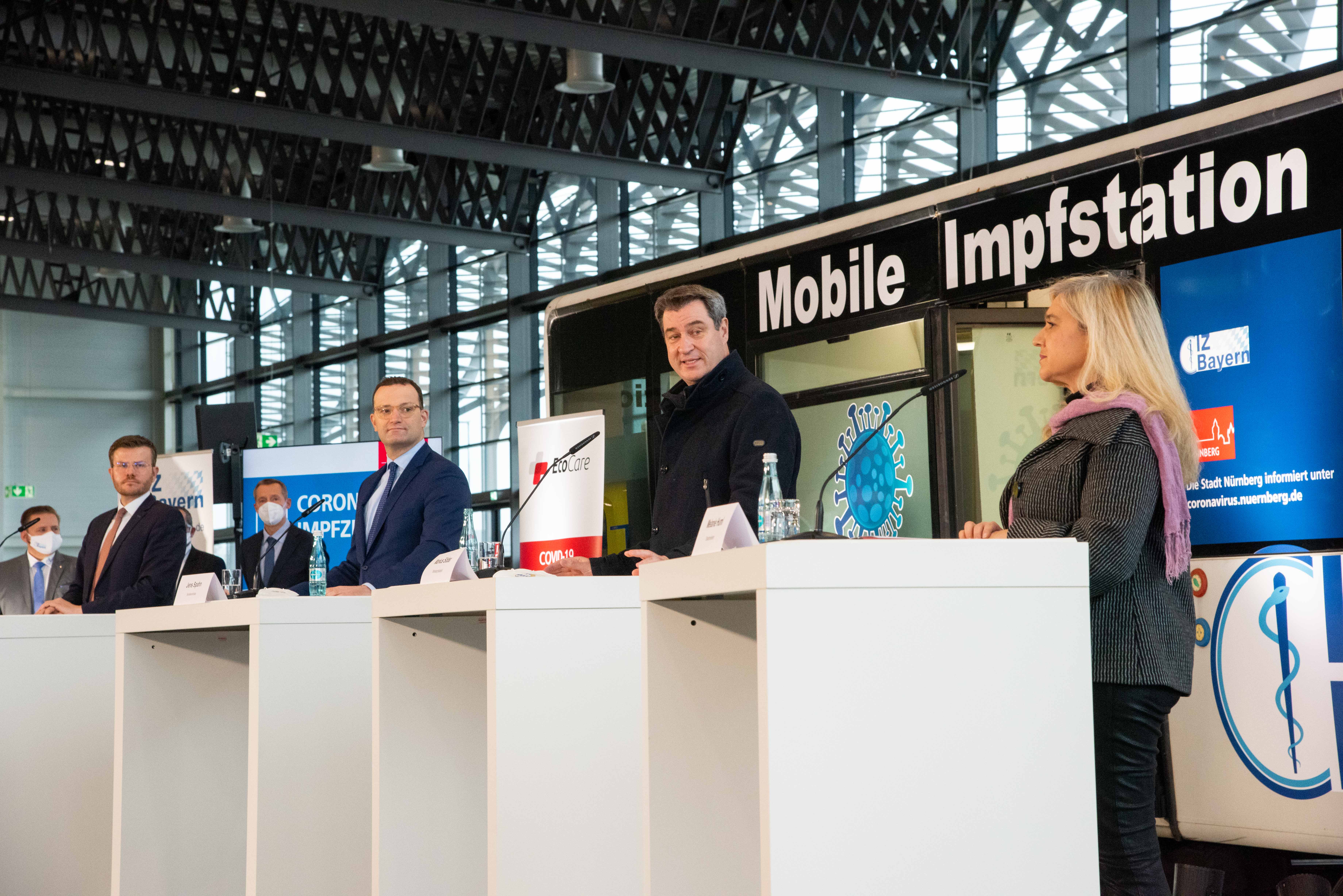 Bei einer Pressekonferenz am Freitag, 11. Dezember 2020, im Impfzentrum der Stadt Nürnberg in der Messehalle 3C der NürnbergMesse erläutern Nürnbergs Oberbürgermeister Marcus König, Bundesgesundheitsminister Jens Spahn, der bayerische Ministerpräsident Dr. Markus Söder und die bayerische Staatsministerin für Gesundheit und Pflege, Melanie Huml (von links nach rechts), die Umsetzung der Impfstrategie des Bundes und der Länder. Das Impfzentrum Nürnberg wird von der Fa. Ecolog Deutschland GmbH betrieben und ist ab Dienstag, 15. Dezember 2020, einsatzbereit.