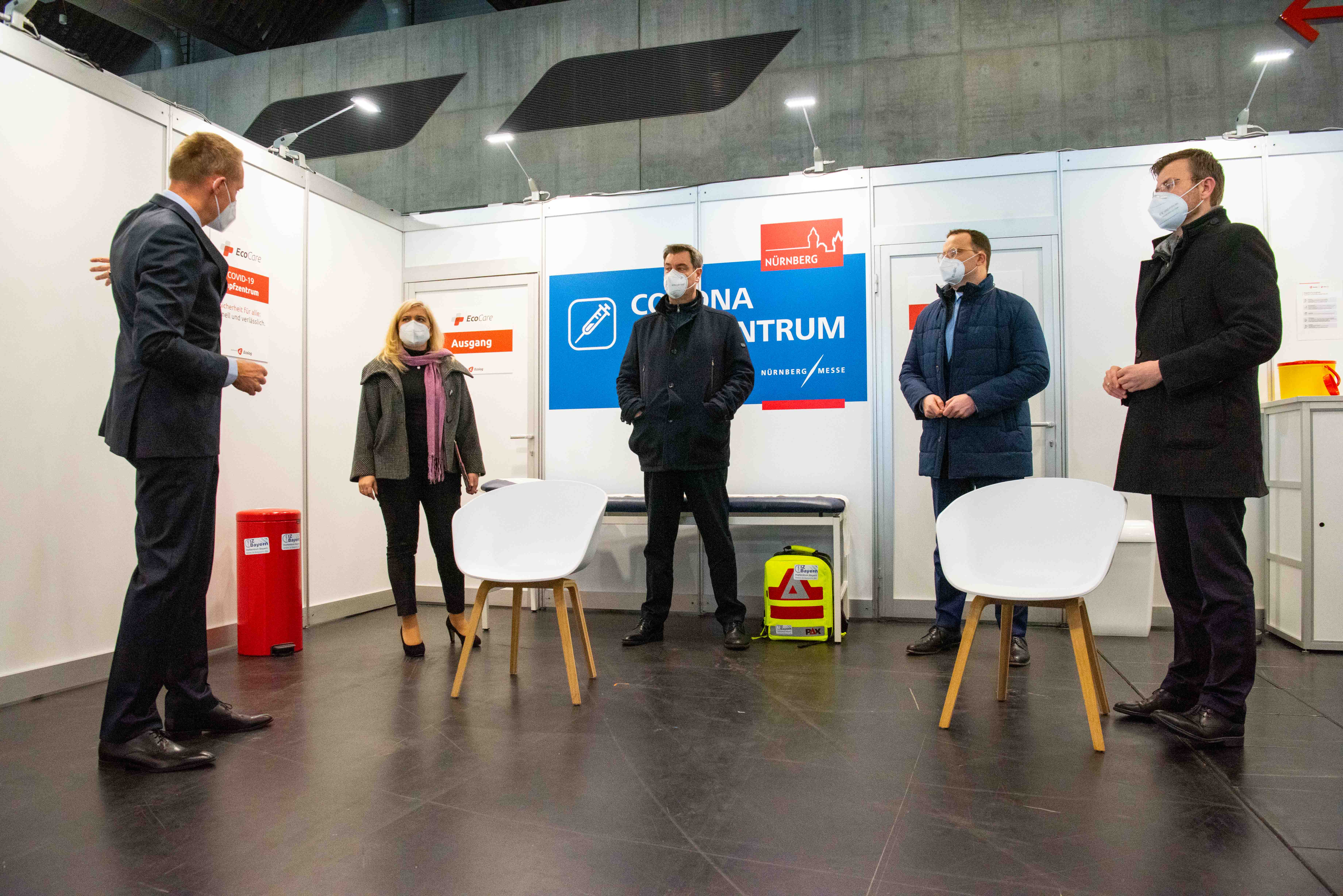 Das Corona-Impfzentrum der Stadt Nürnberg in der Halle 3C der NürnbergMesse wird am Dienstag, 15. Dezember 2020, einsatzbereit sein. Bei einem Besuch vor Ort haben sich am heutigen Freitag, 11. Dezember 2020, Oberbürgermeister Marcus König, Ministerpräsident Dr. Markus Söder, Bundesgesundheitsminister Jens Spahn und Melanie Huml, bayerische Staatsministerin für Gesundheit, über die Aufbauarbeiten und den künftigen Ablauf im Impfzentrum informiert.