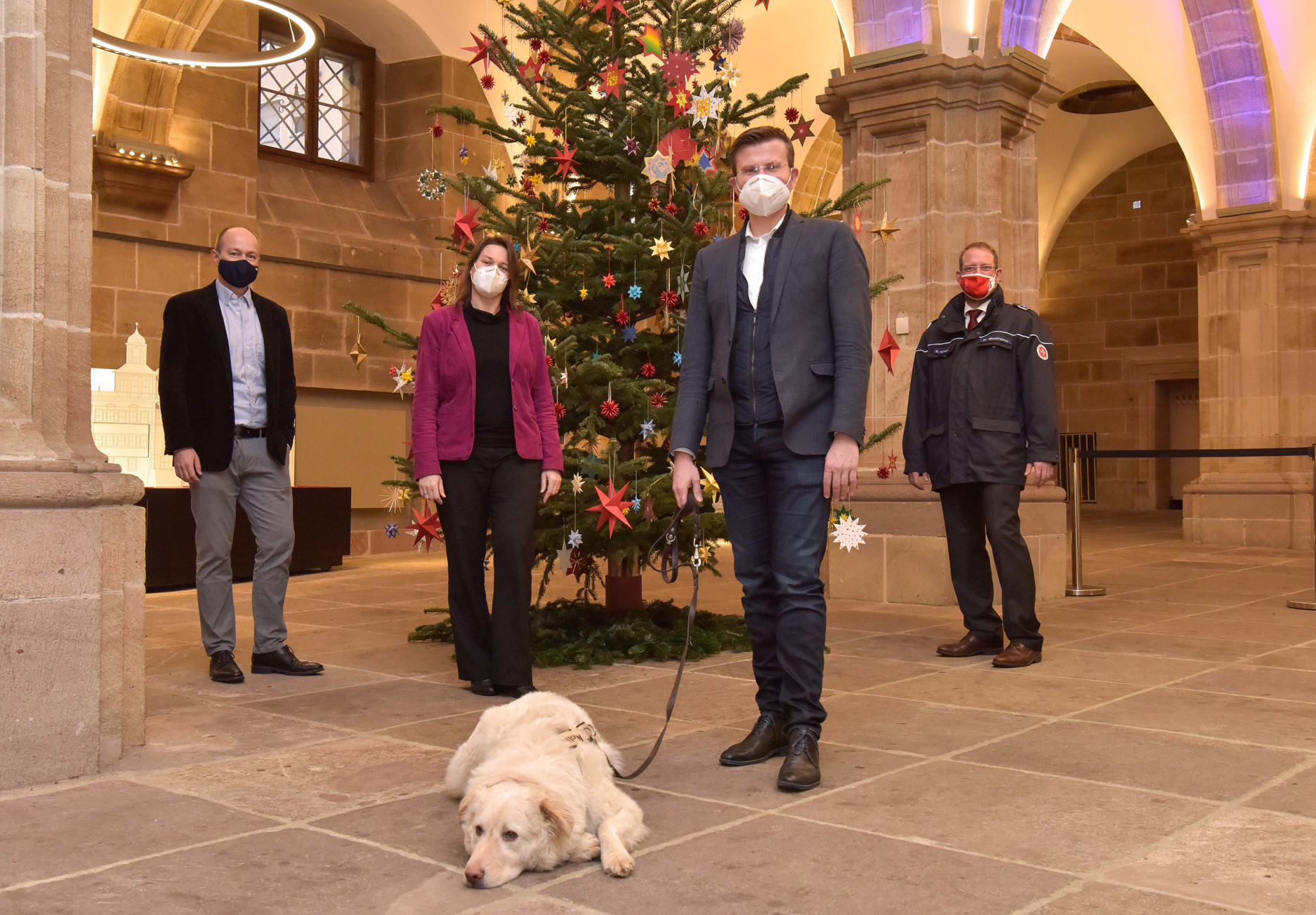 V.l.n.r.: Volker Wolfrum, Leiter des Sozialamts, Elisabeth Ries, Referentin für Jugend, Familie und Soziales, Oberbürgermeister Marcus König, Kevin Schwarzer, Regionalvorstand der Johanniter Mittelfranken. Im Vordergrund liegt Hündin Molly.