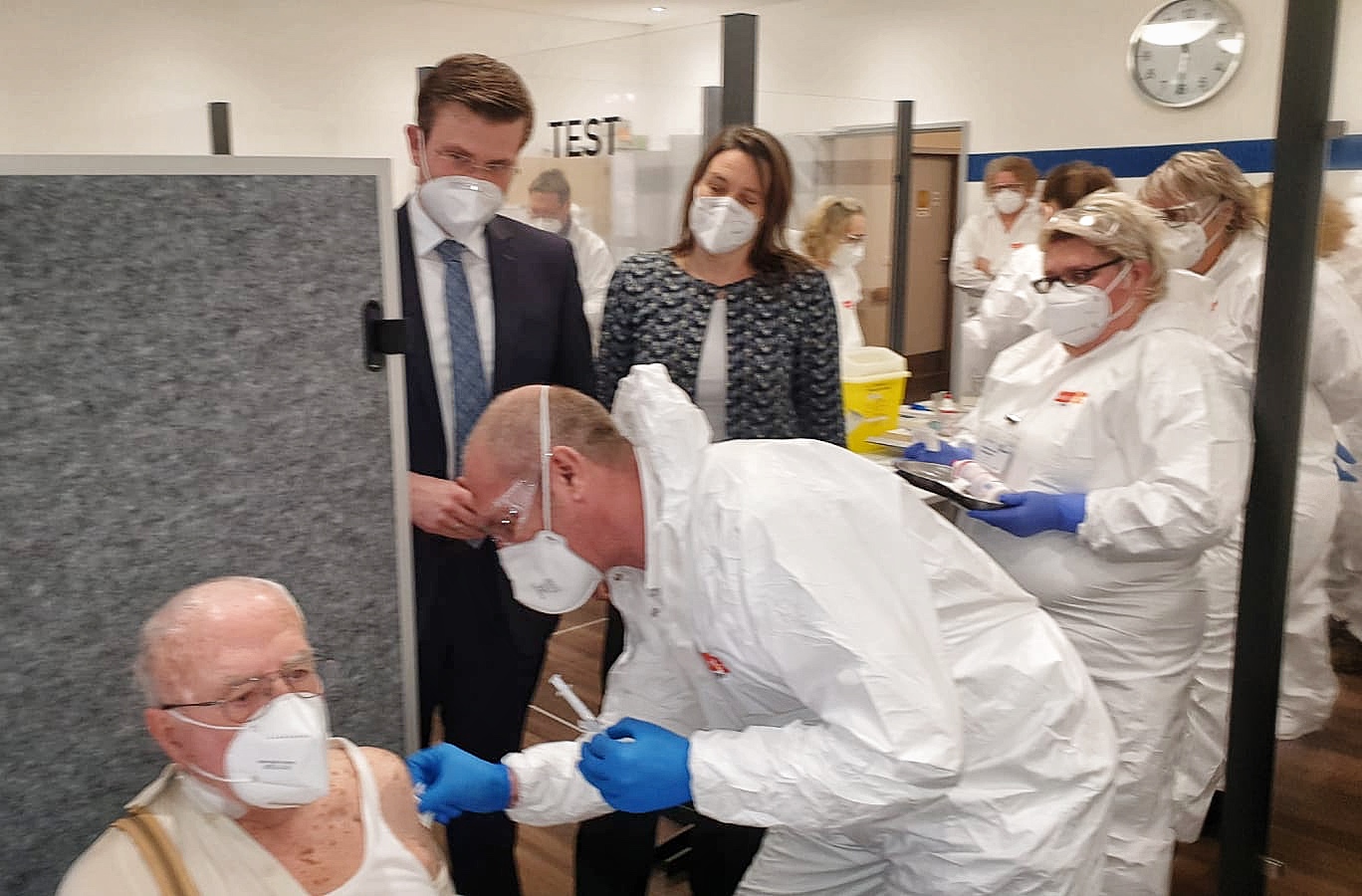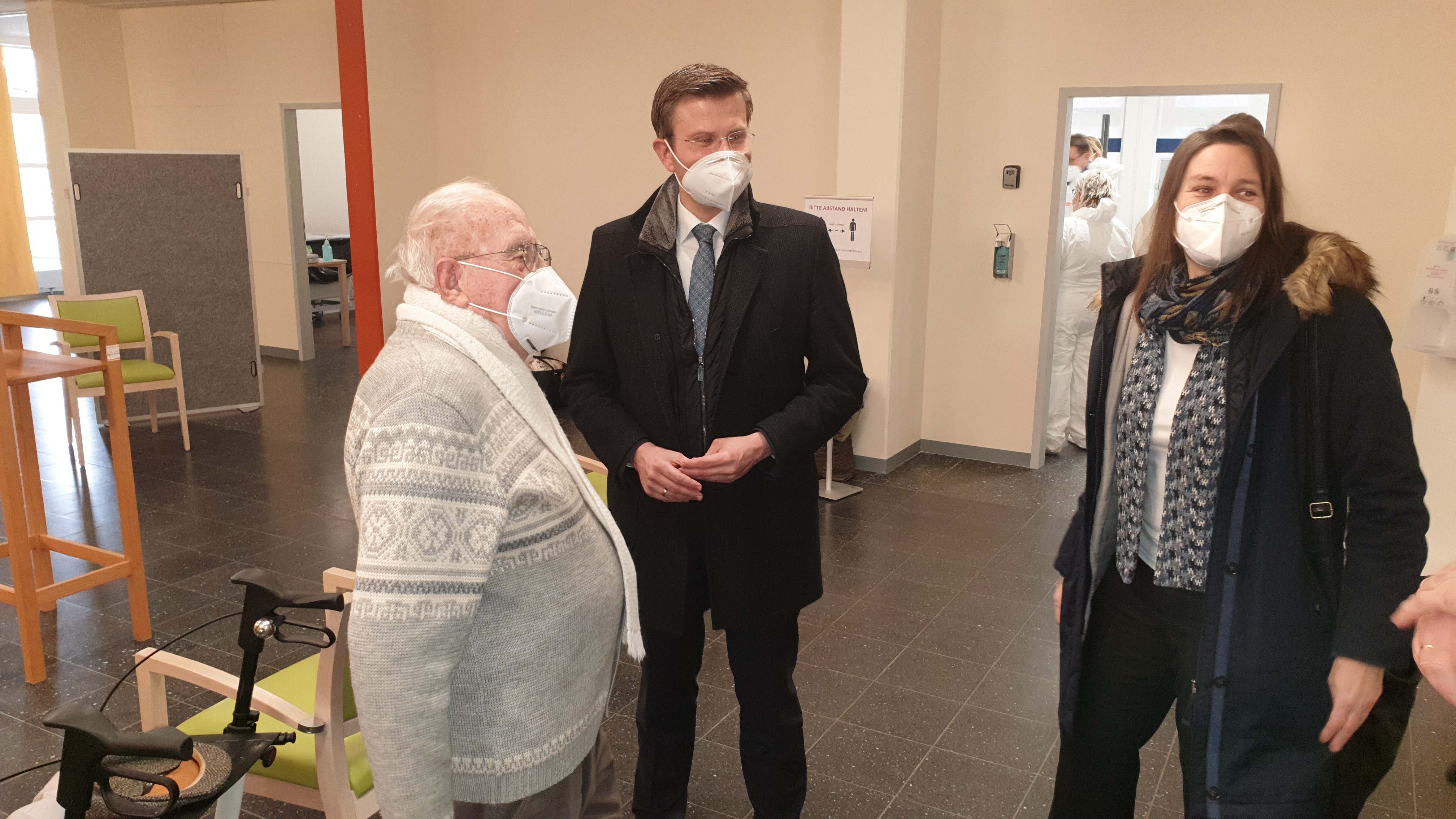 Oberbürgermeister Marcus König und die Referentin für Jugend, Familie und Soziales, Elisabeth Ries, bei einer der ersten Impfungen gegen Covid-19 in einem Nürnberger Seniorenheim.