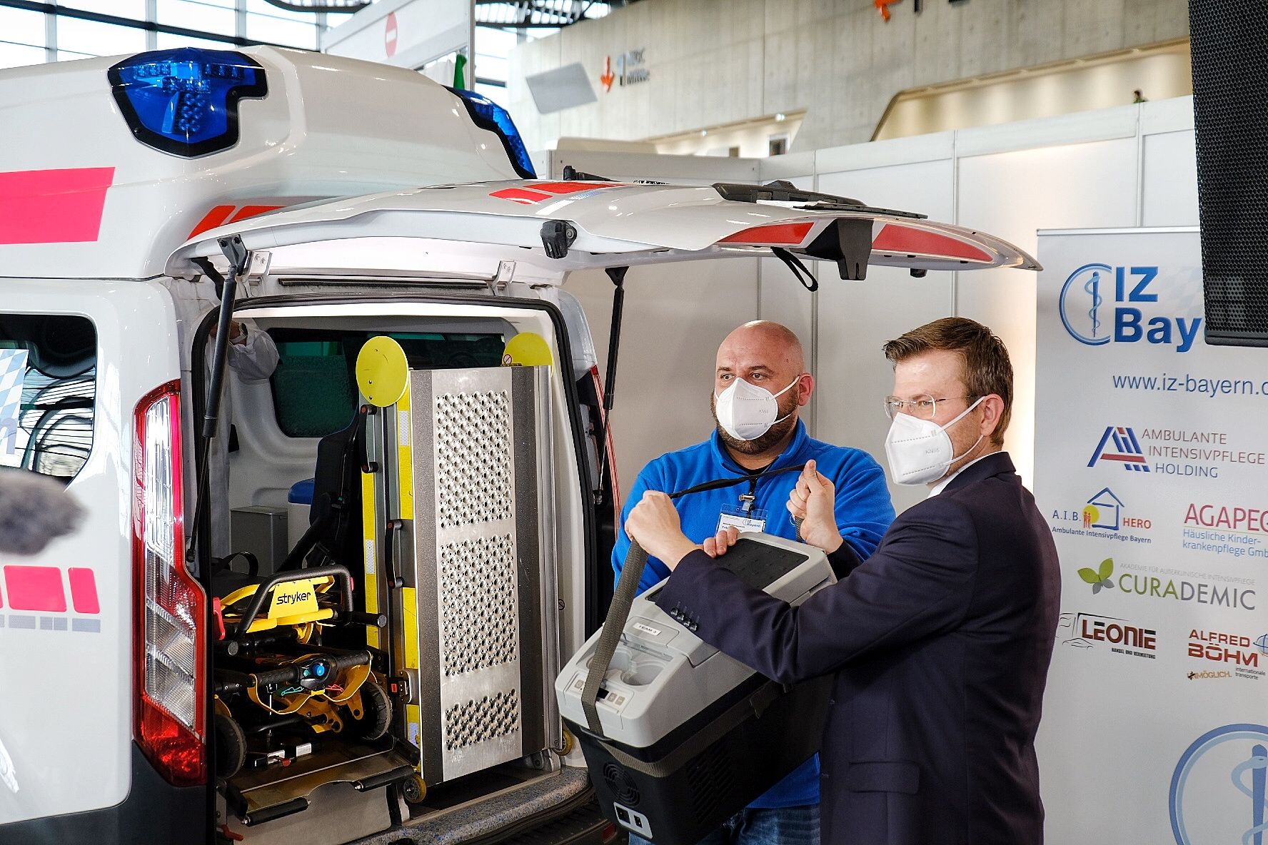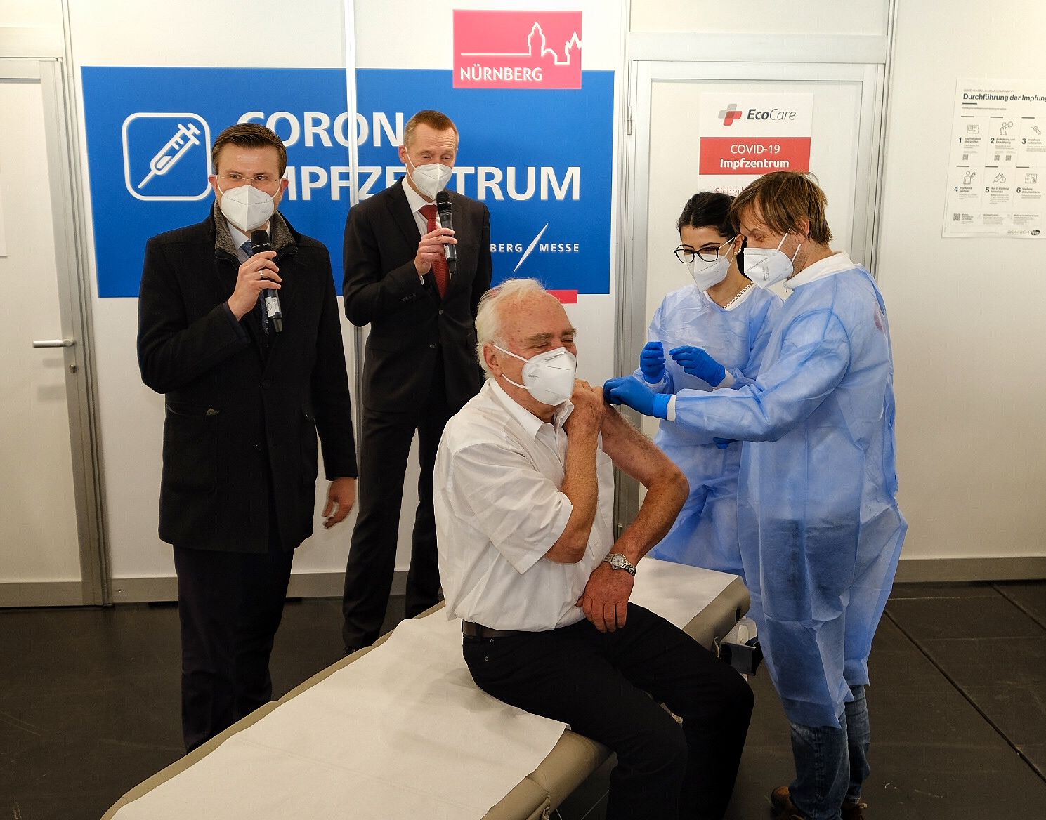Das Impfzentrum in Nürnberg hatte am Samstag, 26. Dezember 2020, 20 Fläschchen mit jeweils fünf Dosen des Biontech/Pfizer-Impfstoffs aus dem Zentrallager in Erlangen erhalten. 16 Fläschchen erhielten die mobilen Teams. Die Teams verabreichten die Impfdosen in einem Seniorenheim des NürnbergStifts an 80 Bewohnerinnen und Bewohner. Die Senioren hatten sich für die freiwillige Impfung gemeldet. OB Marcus König und Elisabeth Ries, Referentin für Jugend, Familie und Soziales, besuchten am Vormittag die Einrichtung und informierten sich über die erste Impfung in einer Nürnberger Senioreneinrichtung.