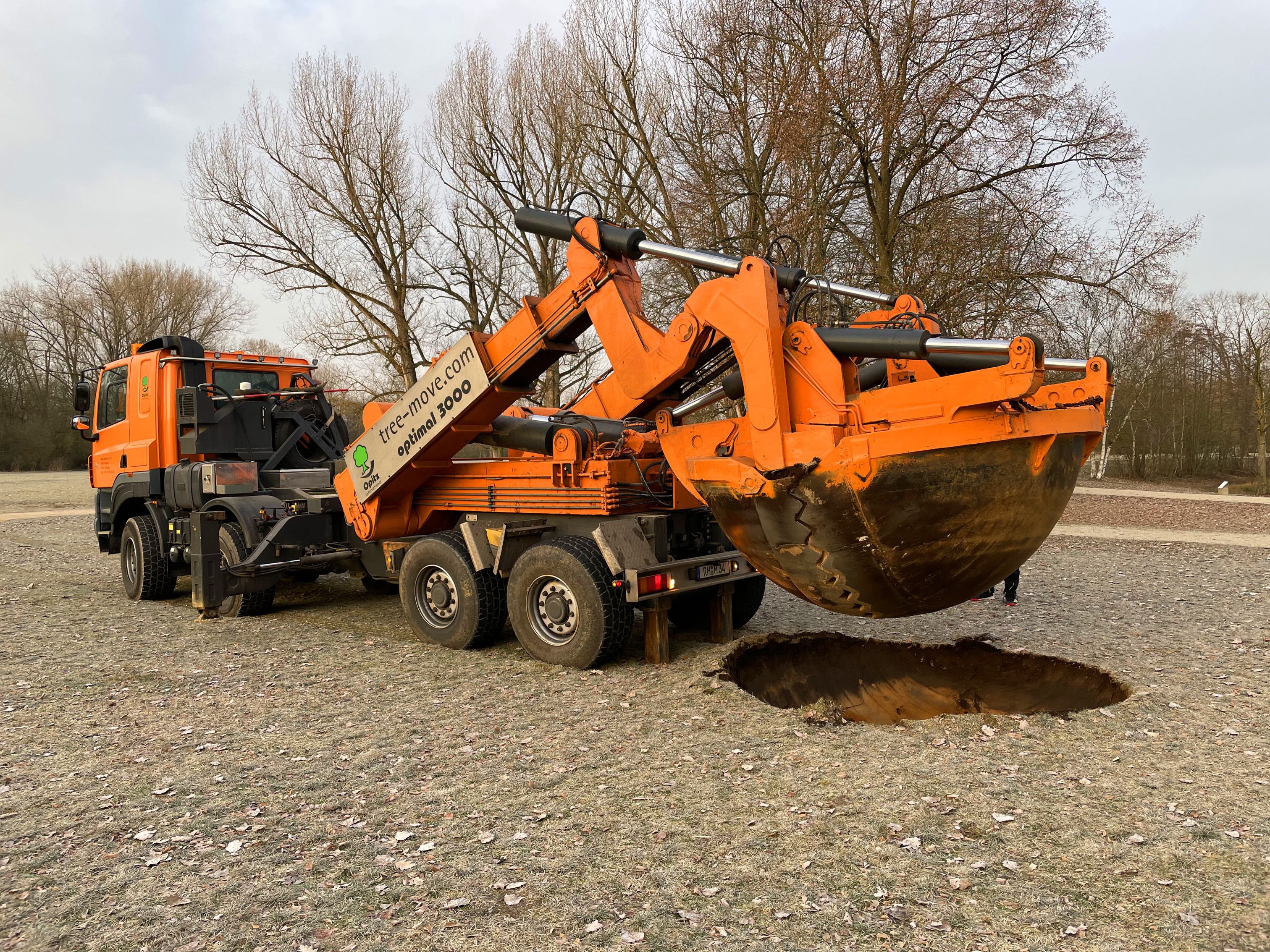 Wenn feststeht, dass ein Baum aufgrund seiner Vitalität und zu erwartenden Lebensdauer für eine Verpflanzung geeignet ist, wird er mithilfe eines Spezialgeräts versetzt: Der eingesetzte Lkw verfügt über eine runde Schaufel, die sich um den Wurzelballen schließt, sodass der Baum ausgegraben und gleichzeitig emporgehoben werden kann. In der Schaufel festgehalten, wird der Baum dann zu seinem neuen Standort gefahren, an dem das Pflanzloch bereits vorbereitet ist, und dort eingesetzt. Damit die Wurzeln gut anwachsen und der Baum am neuen Standort noch lange Jahre weiterwachsen kann, führen die SörMitarbeiterinnen und -Mitarbeiter im Rahmen der Baumkontrolle und pflege eine sorgfältige Nachsorge durch.