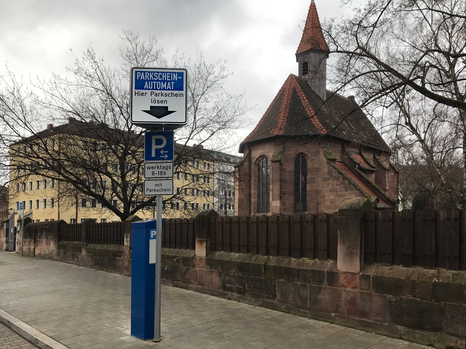 Der Servicebetrieb Öffentlicher Raum Nürnberg (Sör) hat in der Straße Beim Rochuskirchhof am Mittwoch, 24. März 2021, den Parkscheinautomaten vor Ort mit einer neuen Funktion ausgerüstet. Wer auf die OK-Taste drückt ohne Geld einzuwerfen, erhält ein Freiticket mit einer Parkdauer von 15 Minuten. Diese Umstellung soll die Parkplatzsuche für Besucherinnen und Besucher im Umfeld des historischen Gostenhofer Friedhofs erleichtern. Beim Rochuskirchhof muss in der Zeit von Montag bis Samstag zwischen 8 und 18 Uhr ein Parkschein gelöst werden. Die maximale Parkdauer ist auf zwei Stunden begrenzt. Trotzdem ist es häufig schwierig, einen freien Parkplatz zu finden.