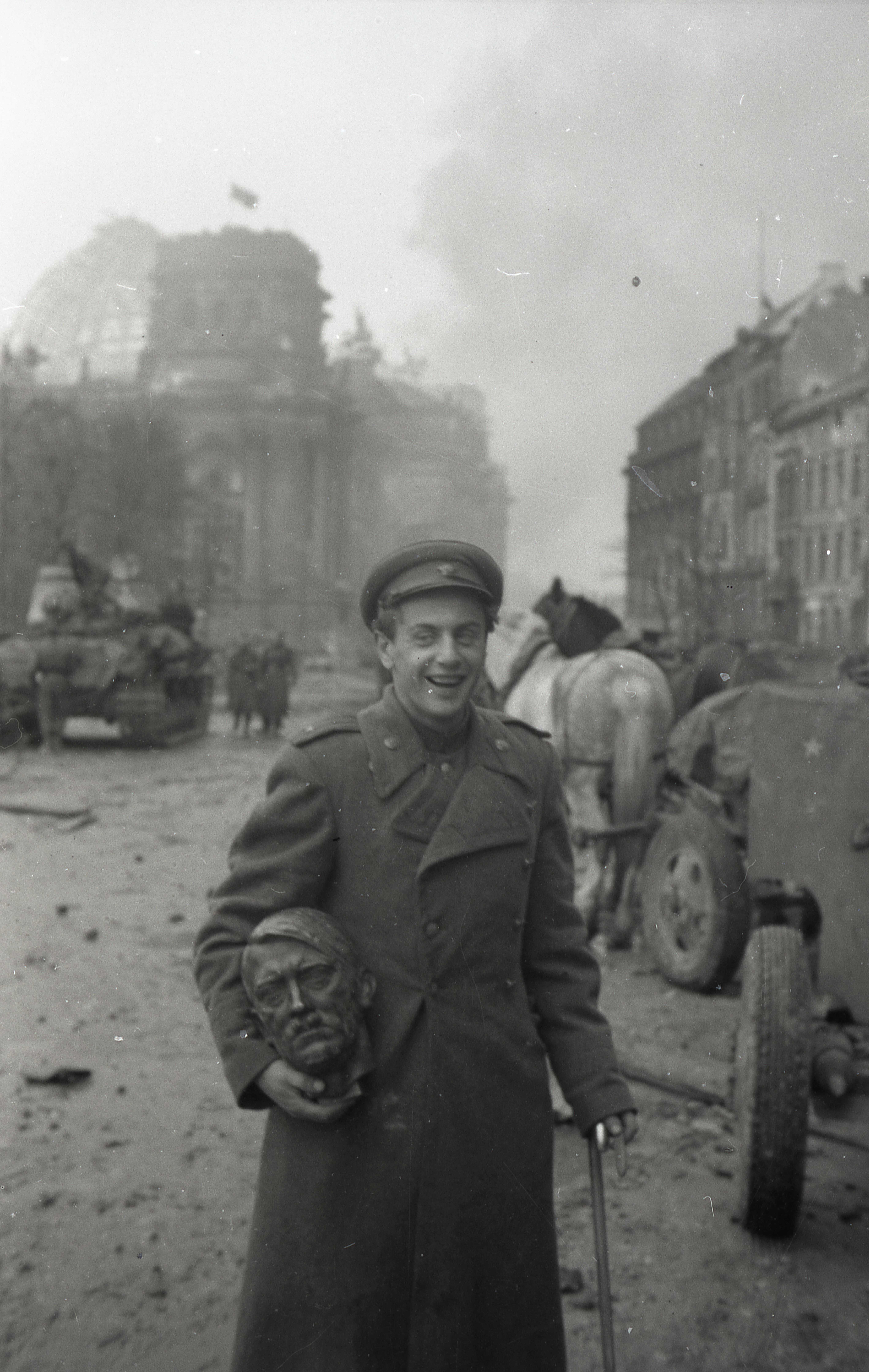 Bild Download: Dichter Ewgenij Dolmatowskij mit einer Trophäe in Form eines Hitlerskulpturkopfs, Berlin, 2. Mai 1945.