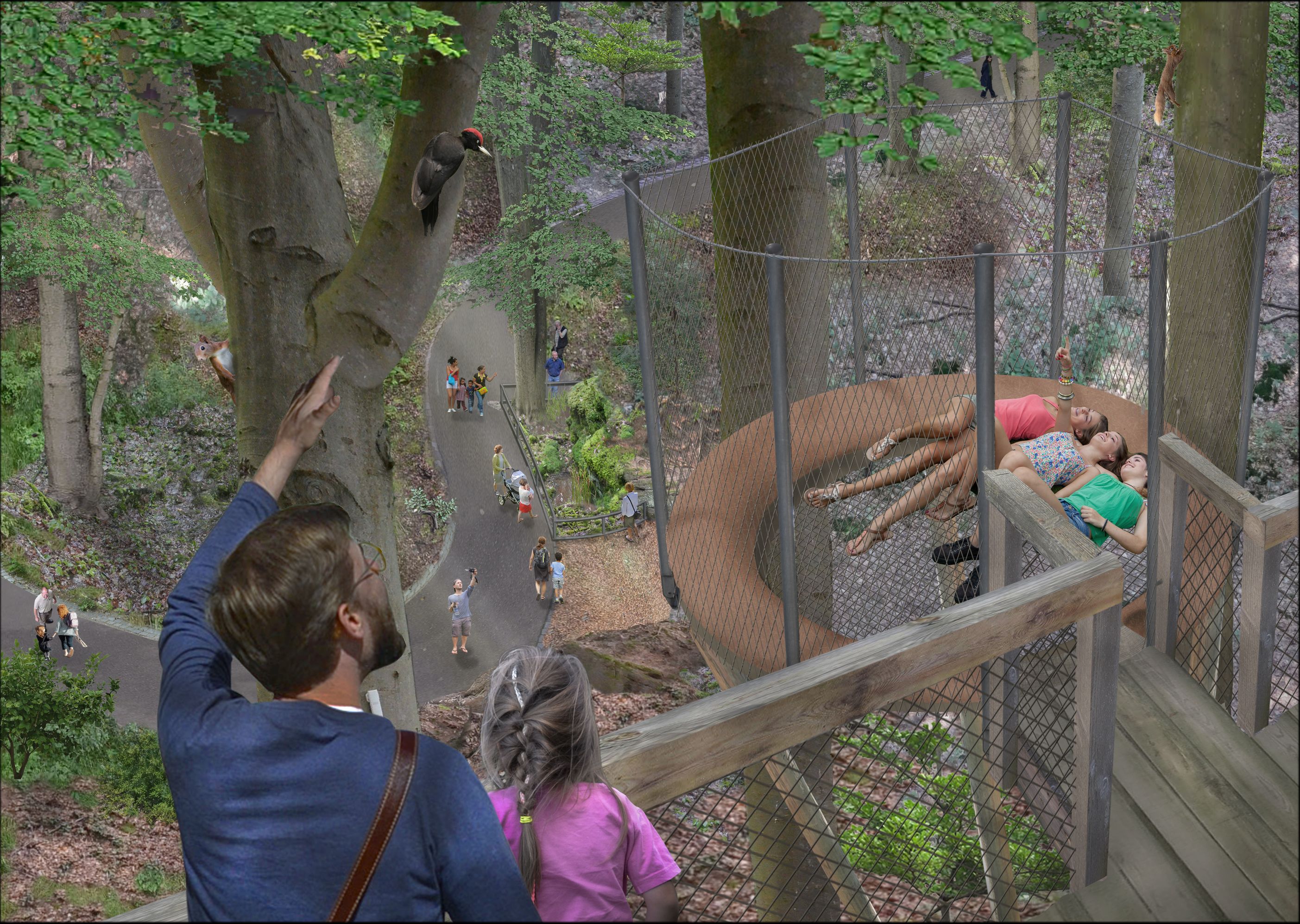 Bürgermeister Christian Vogel erklärt: „Der Waldpfad erschließt nicht nur neue Tiergehege, sondern ragt weit über den Tiergarten hinaus in den Reichswald. Hier thematisieren wir die ökologische Bedeutung des Walds und die Bedeutung alter Baumbestände. Das alles machen wir waldschonend in 20 Metern Höhe, der Waldboden bleibt unangetastet und der Wald kann sich durch Neupflanzungen erholen. Wir schaffen außerdem direkt in den Baumkronen ein grünes Klassenzimmer als Lernort, aber auch Stellen, an denen man spielen, klettern, schaukeln oder liegen und verweilen kann.“