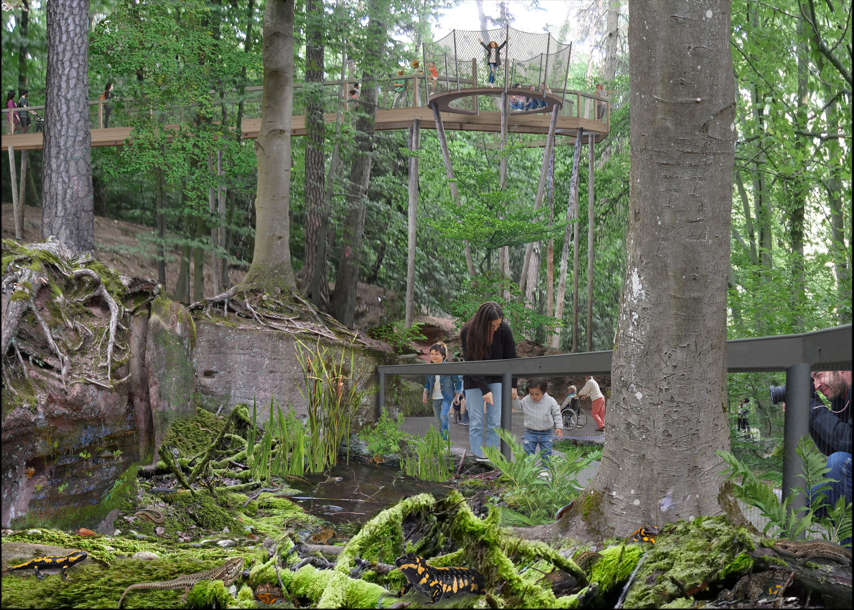 Bereits 2010 entwickelte der Tiergarten nach umfangreichen Recherchen ein Konzept für einen waldschonenden und barrierefreien Baumwipfelpfad. Daraus ging der Entwurf für einen Waldpfad auf dem Gelände des Tiergartens hervor. Der Waldpfad beginnt und endet ebenerdig und ist über den gesamten Streckenverlauf barrierefrei. Der Pfad ist nach Themen unterteilt. Auf dem Zoogelände des Tiergartens sollen Tiergehege unter den Pfad gelegt werden, in denen typische Waldbewohner Europas und Asiens vorgestellt werden. Ein Segment widmet sich den mittlerweile auch in Europa stark bedrohten Amphibien, speziell dem Feuersalamander. Ein künftiger thematischer Höhepunkt soll eine Waldvogelvoliere für heimische Waldvögel sein, in der die Vielfalt und Schönheit der heimischen Vogelwelt erlebbar gemacht wird. Für Asiatische Leoparden wird im Wald ein Bereich eingenetzt. Dieses Gehege ist noch nicht projektiert, da es erst in der aktuellen Projektphase im Förderantrag bei der Zukunftsstiftung der Sparkasse als Eigenanteil des Gesamtprojekts entwickelt wurde.