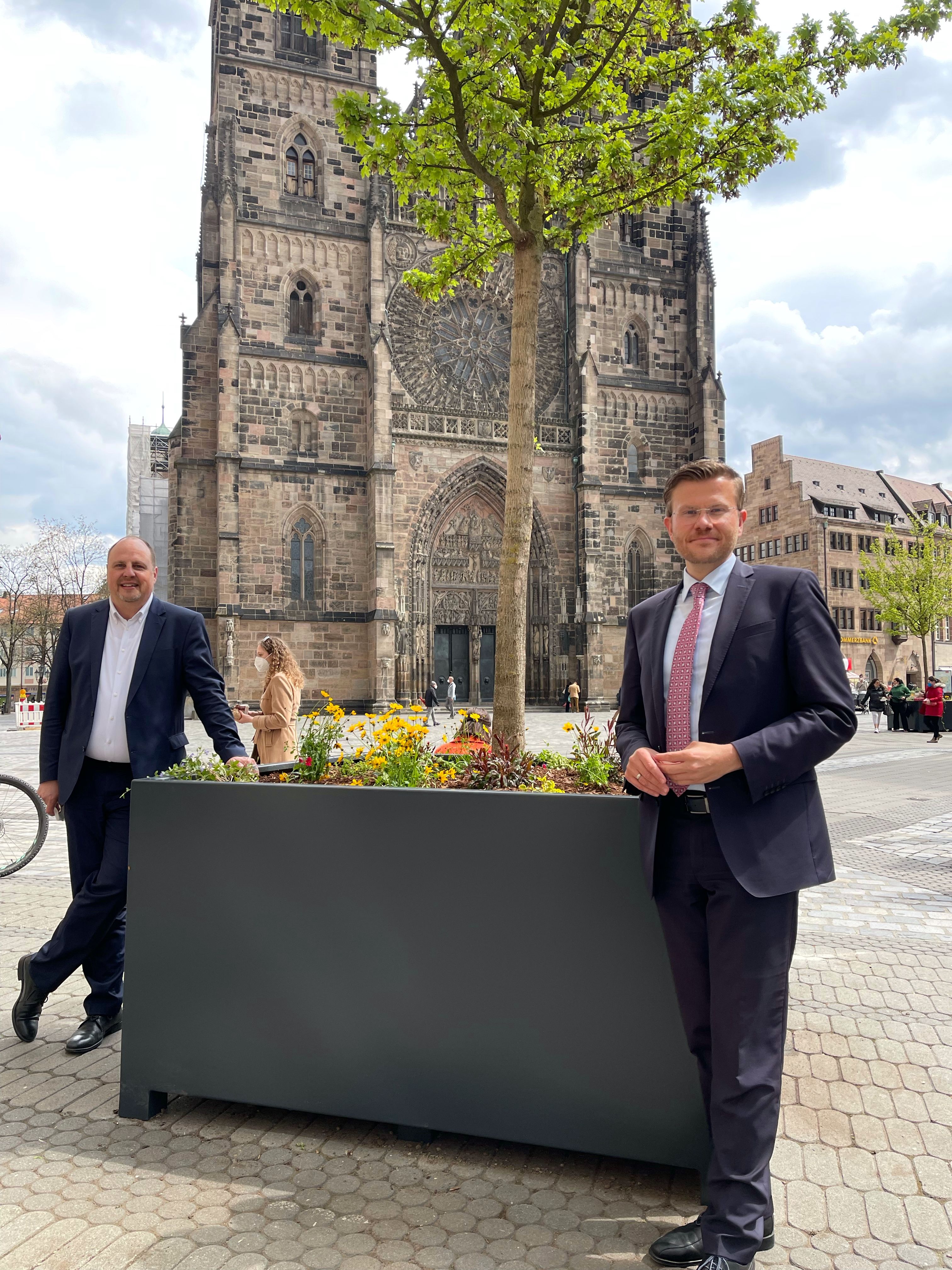 Der Lorenzer Platz soll grüner werden. Deshalb haben Oberbürgermeister Marcus König, Christian Vogel, Bürgermeister und Erster Werkleiter des Servicebetriebs Öffentlicher Raum Nürnberg (Sör), Planungs- und Baureferent Daniel F. Ulrich sowie Daniela Bock, Vorsitzende des Vereins Grünclusiv e.V., und Gerhard Zäh, Präsident des Verbands Garten-, Landschafts- und Sportplatzbau Bayern e.V. (VGL Bayern), am heutigen Donnerstag, 29. April 2021, auf dem Platz vor dem Hauptportal der Lorenzkirche zwölf Kübelbäume aufgestellt. Die Standorte wurden nach stadtgestalterischen und denkmalfachlichen Aspekten sorgsam ausgewählt, die Aufstellung der Bäume erfolgte durch Sör.