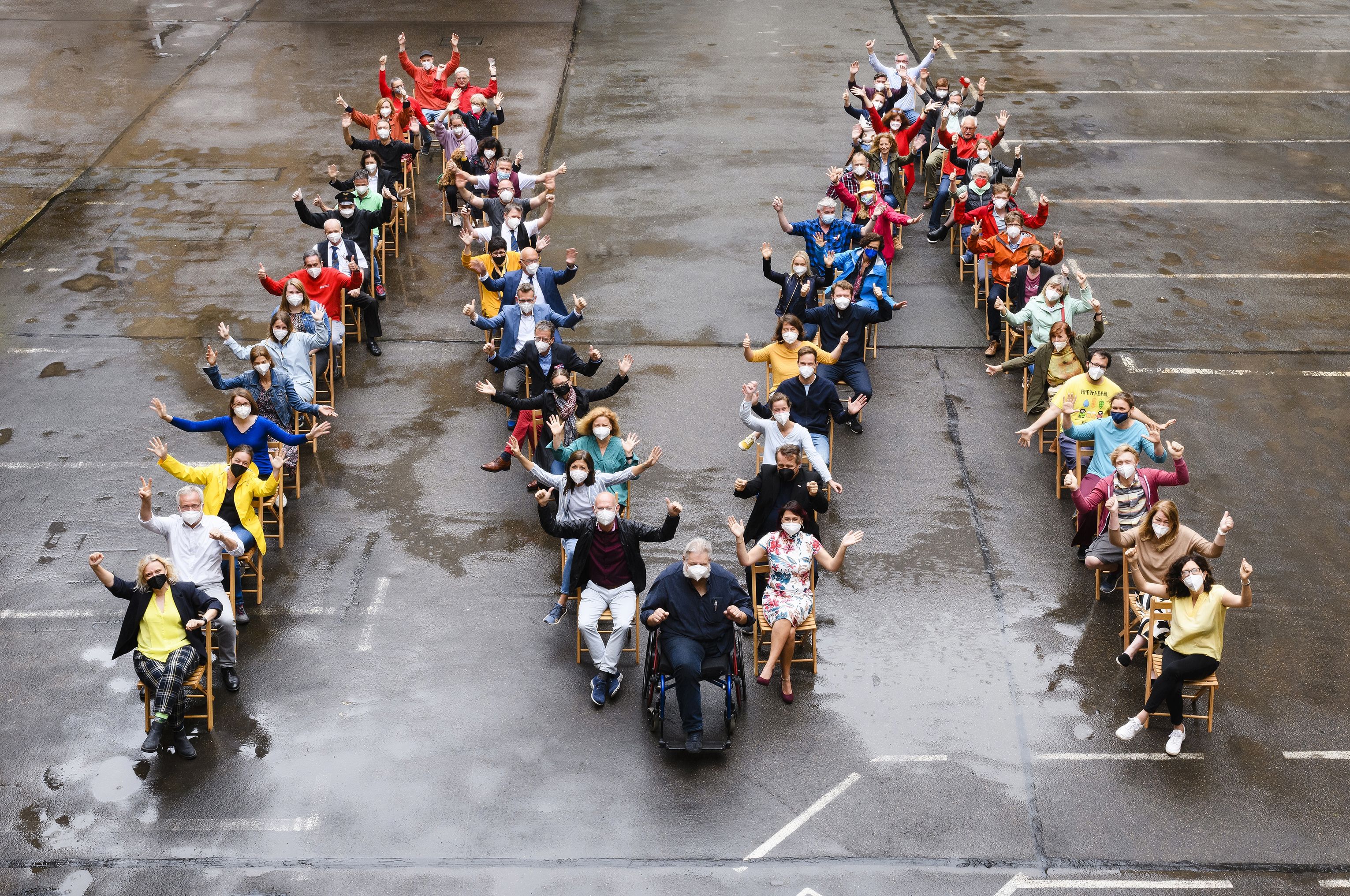 Probesitzen für eine gemeinsame Idee: Mitarbeiterinnen und Mitarbeitern von Nürnberger Museen formen ein großes M für die Reihe "Muse im Museum", die am 10. Juli um 15.30 Uhr mit einem Corso durch die Altstadt startet.