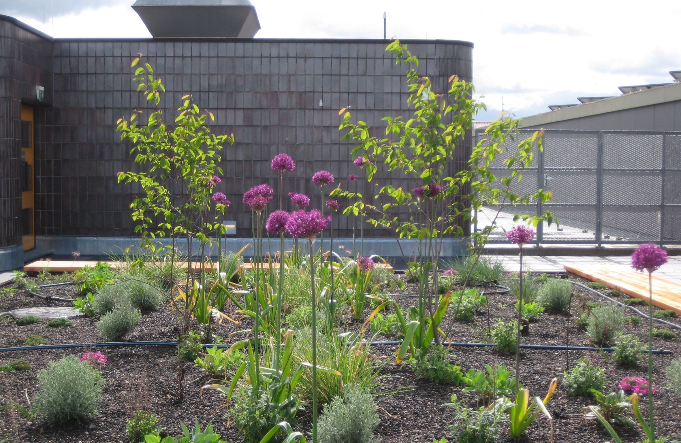 Grüner Pausenhof mit Hochbeet auf dem Dach des Berufsbildungszentrums (BBZ), Äußere Bayreuther Straße 8, in Nürnberg.